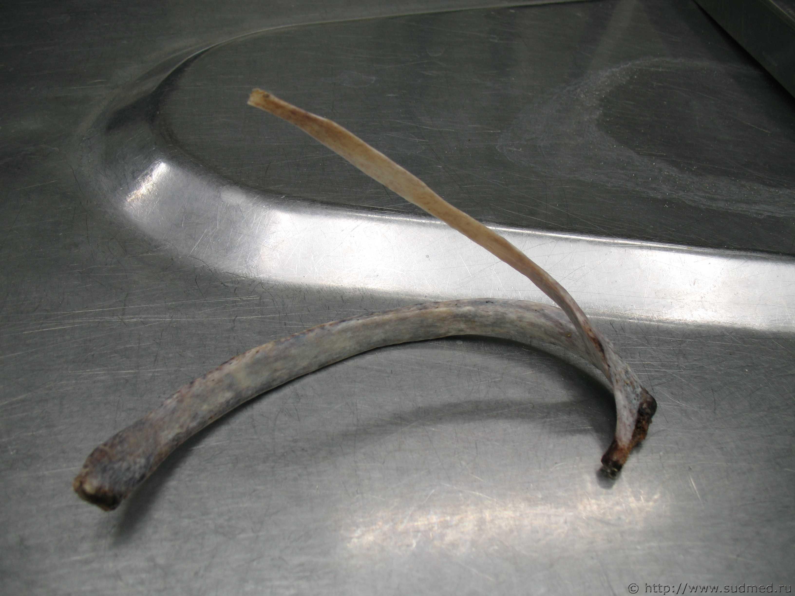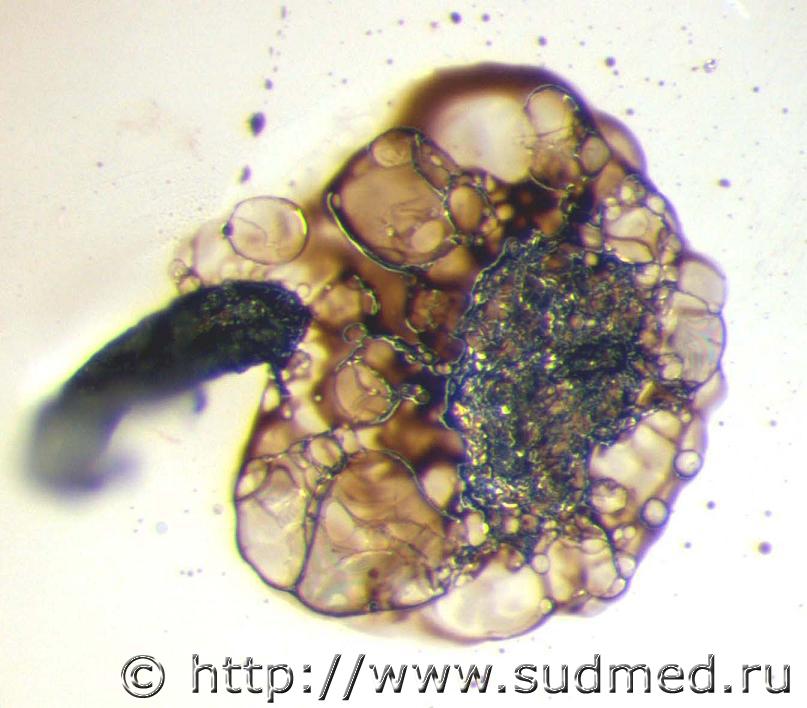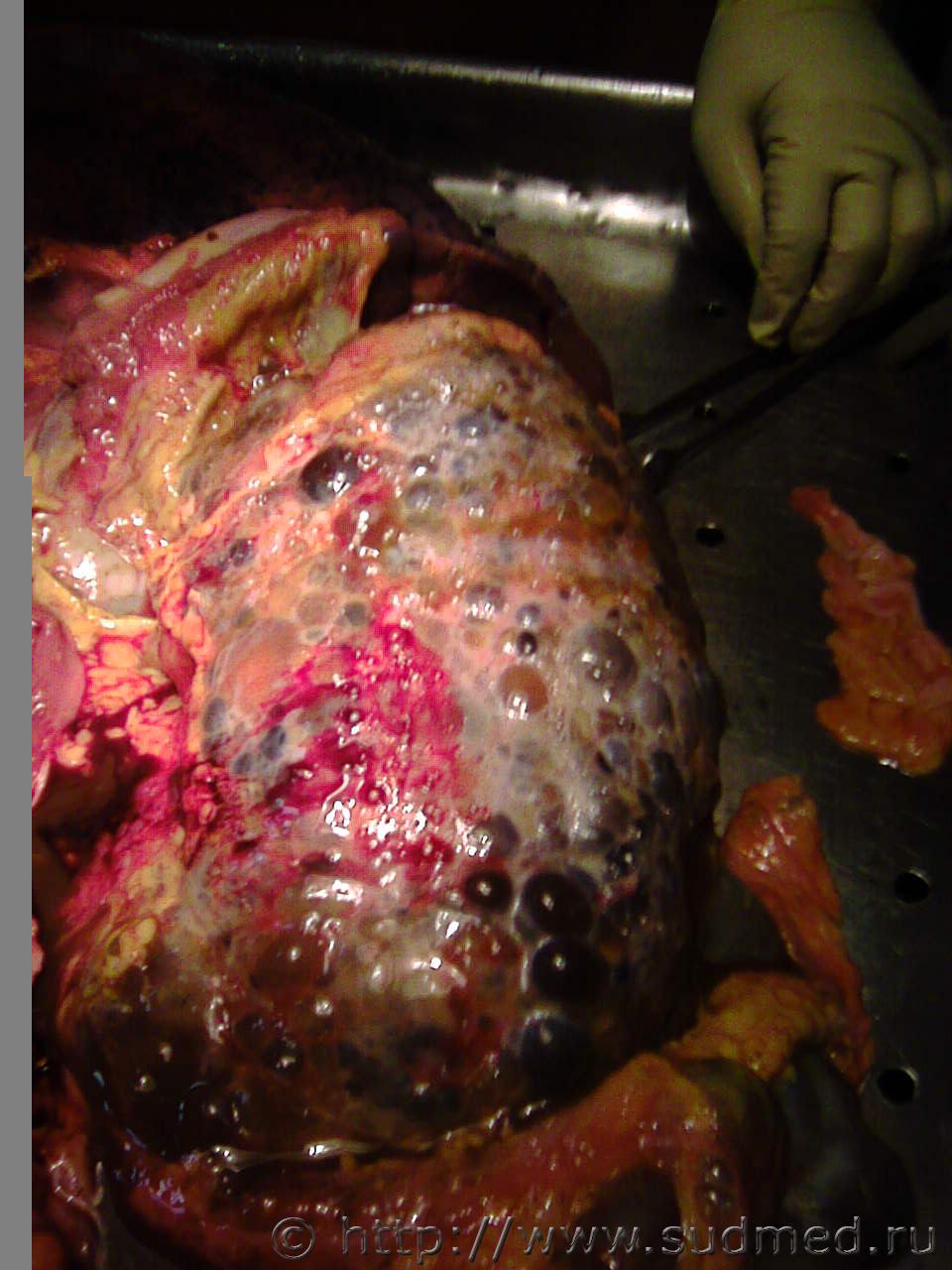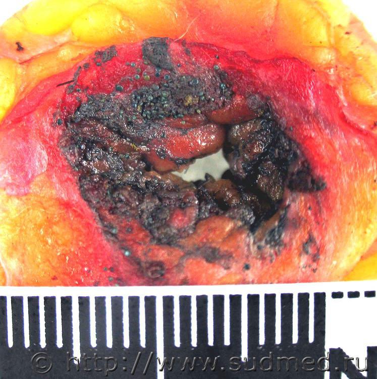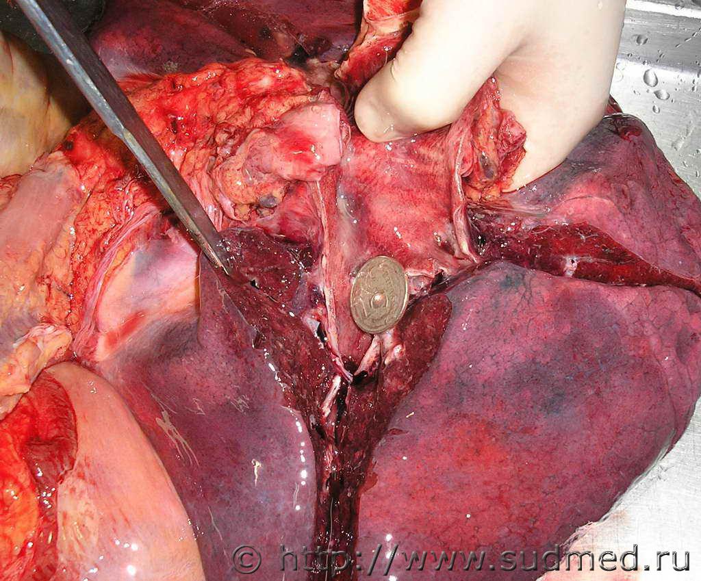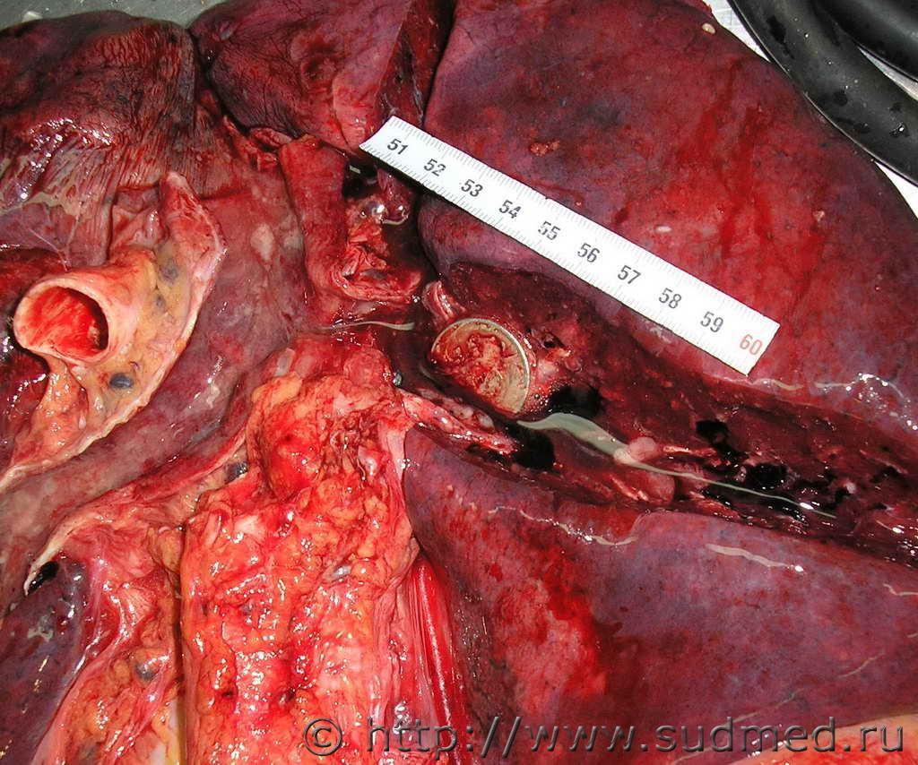 Труп из стационара после 4-дневного лечения. Заключительный клинический диагноз «патологическое действие низких температур». Запись врача приёмного отделения в медкарте «… во рту 10 рублей купюрой измятой… В легких: ясный легочной звук. Аускультативно: жесткое дыхание, единичные сухие свистящие хрипы…». При секции – инородные тела (металлические монеты достоинством 5 рублей и 1 рубль) в правом главном бронхе. Причина смерти – двусторонняя сливная бронхопневмония. ![]() ![]() |