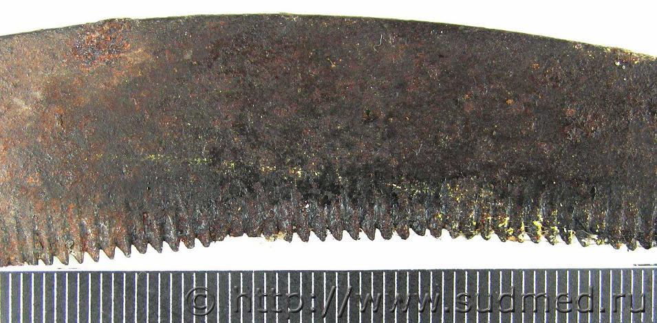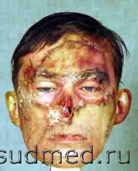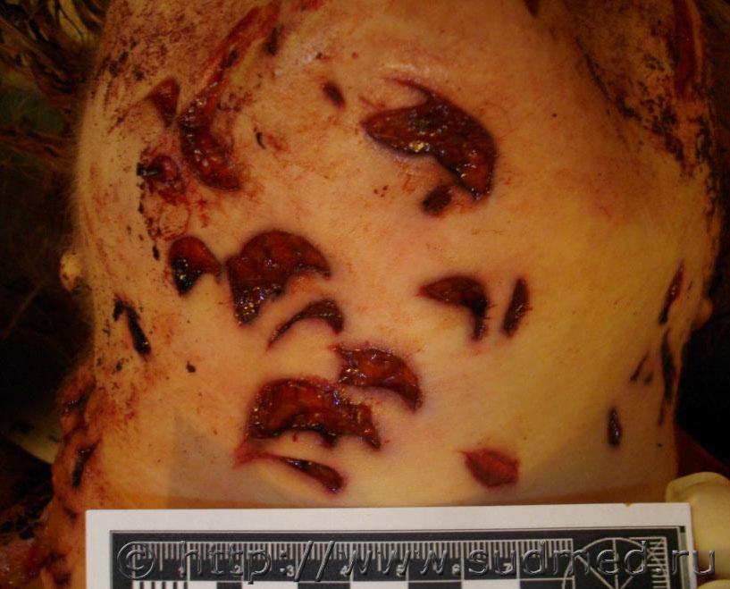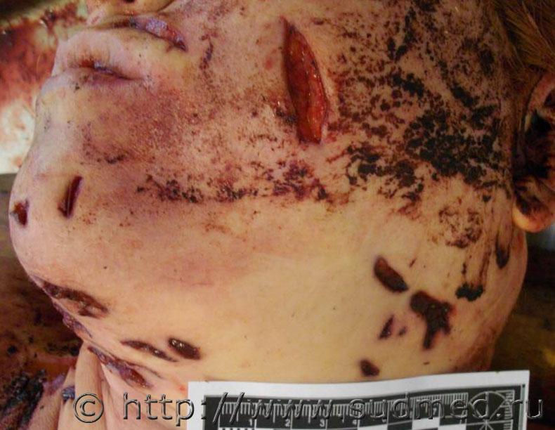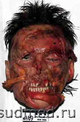 Голова отделена от тела пилой, повреждения на лице образовались от многократного воздействия пилящего предмета посмертно, вероятно с целью затруднения опознания. ![]() ![]() Реставрация проводилась с целью идентификации личности по прижизненному снимку сравнительными методами: словесный портрет и полигональный репераж. С родственниками я не общался. К сожалению сослаться на официально рекомендованную методику реставрации не могу, применял общеизвестные приемы для восстановления и фиксации лоскутов кожи с элементами собственного "творчества", которые родились по ходу реставрации. Привожу этапы реставрации. Для восстановления признаков внешности проводилась реставрация и туалет головы. С этой целью на края ран и ушные раковины были наложены марлевые тампоны, пропитанные спиртово-уксусным раствором с добавлением перекиси водорода для отбеливания (р-р Ратневского), голова на пять часов помещалась в холодильник при температуре +3-5 градуса Цельсия. После этого, края ран стали мягко-эластичными, сопоставимыми, приобрели желтый цвет с беловатым оттенком. Ушные раковины несколько увеличились в размерах, стали плотно эластичными, розово-красного цвета с желтоватым оттенком. Далее полость черепа заполнялась ветошью смоченной в 1%-м солевом растворе формалина, свод черепа сопоставлялся с костями основания черепа по секционному распилу с прокладками по ходу его толщиной около 1 мм. Кости скреплялись медной проволокой через заранее просверленные крепежные отверстия, края секционного разреза на коже и апоневрозе в теменной области сопоставлялись между собой, сшивались нитками и склеивались моментальным клеем «Авиора монолит» в состав которого входит цианакрилат. Аналогичный клей применялся при сопоставлении краев ран на лице. Глазные яблоки при помощи медицинского шприца с иглой заполнялись дистиллированной водой до образования выпуклости роговицы и плотно эластичного состояния. Волосы на голове смачивались водой и расчесывались по образцу стрижки на представленном прижизненном фотоснимке. Может кому пригодится. |