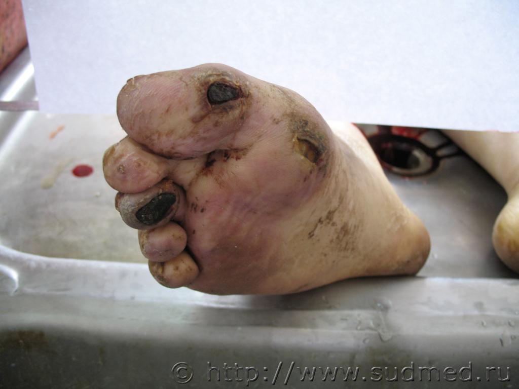 Мужчина,32 лет,проходил лечение в хирургическом стационаре по поводу отморожения пальцев правой стопы.Во время пребывания в больнице перенёс двустороннюю очаговую пневмонию.Через 2 недели после выписки внезапно умер.При исследовании трупа,кроме изменений со стороны правой стопы,выявлены хронический абсцесс левого лёгкого,глубокий венозный тромбоз голеней,тромбоэмболия легочных артерий и геморрагические инфаркты в лёгких.