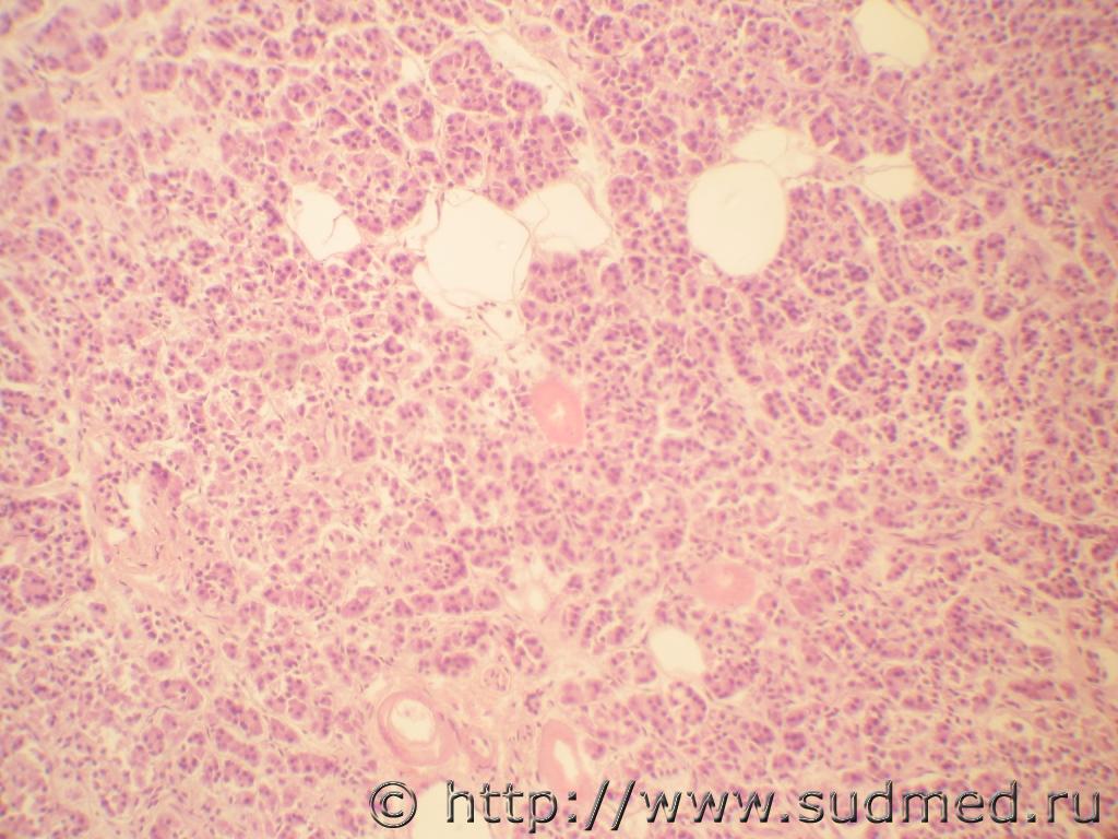 Гипертонический криз.Фибриноидный некроз артериол поджелудочной железы.Большое и малое увеличения микроскопа.