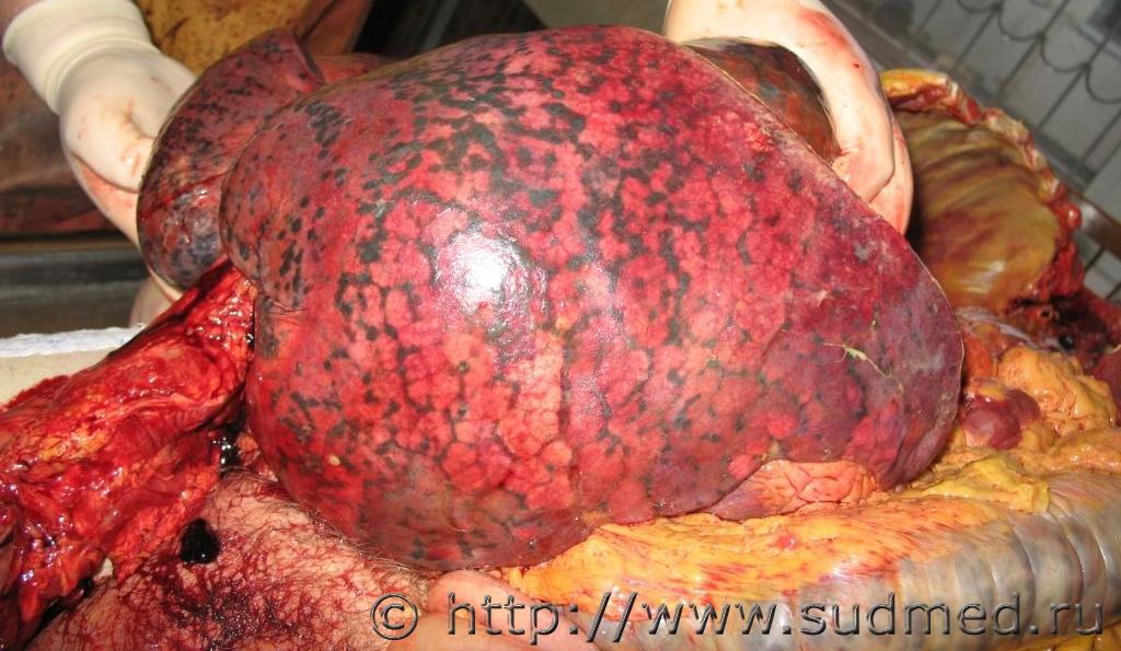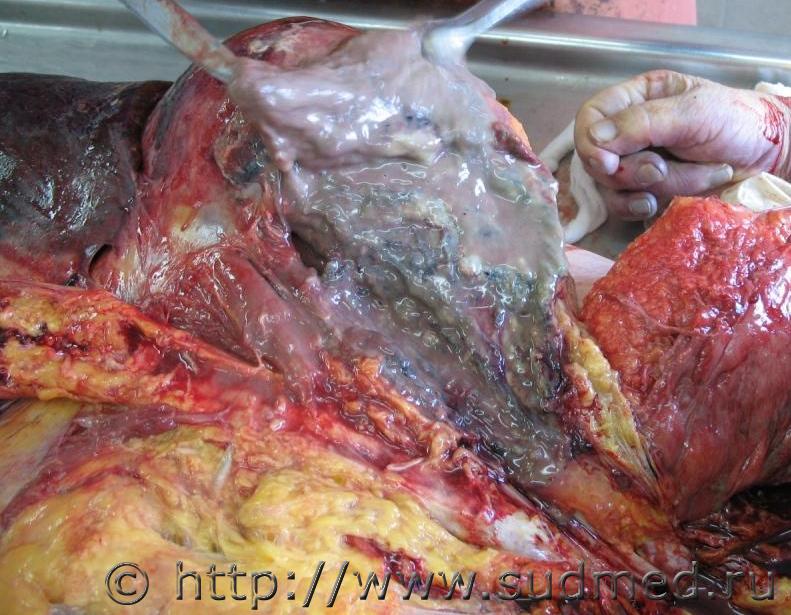 Левосторонняя верхнедолевая плевропневмония,стадия серого опеченения.Вес левого лёгкого 1882г.