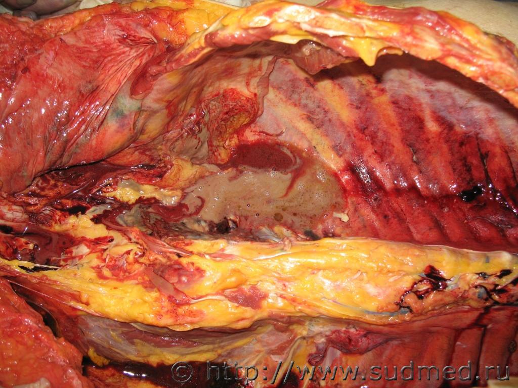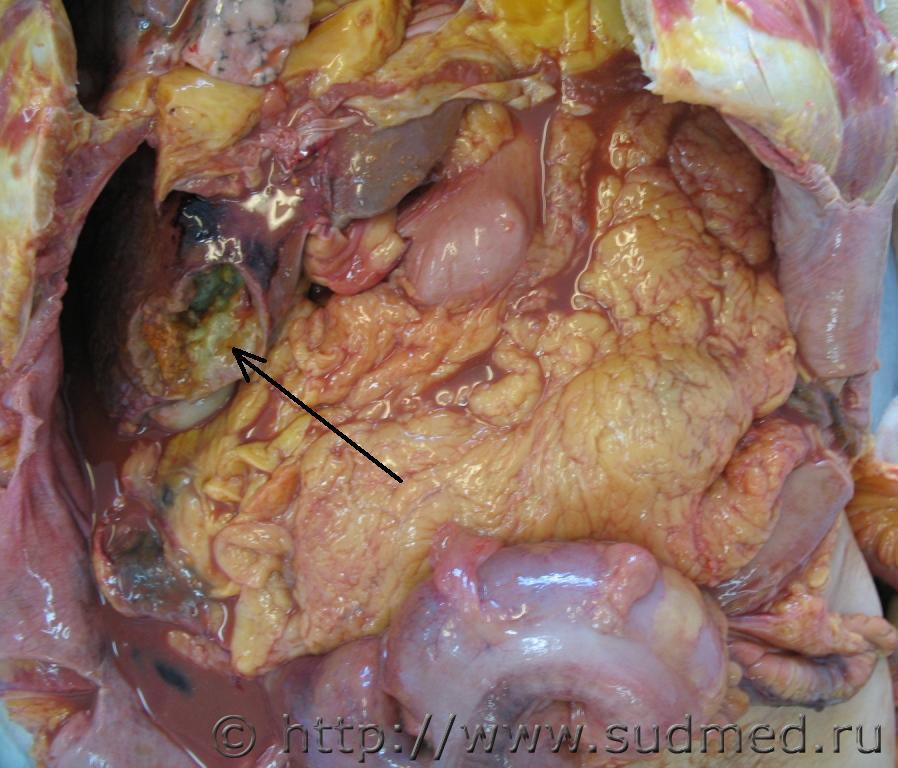 Хронический абсцесс печени,вскрывшийся в брюшную полость.