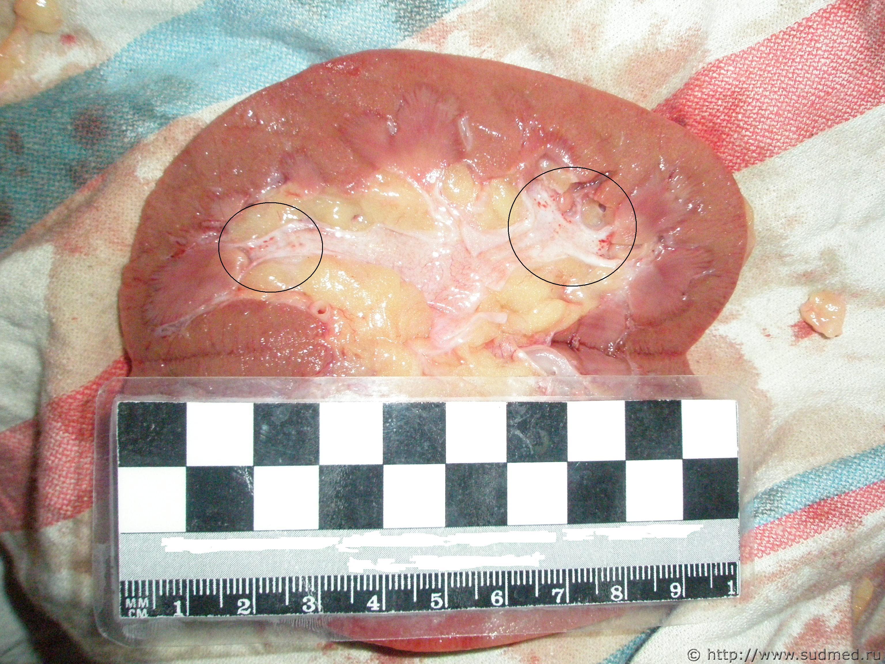 Кровоизлияния в слизистой ЧЛС почек (признак Фабрикантова, общее переохлаждение организма)