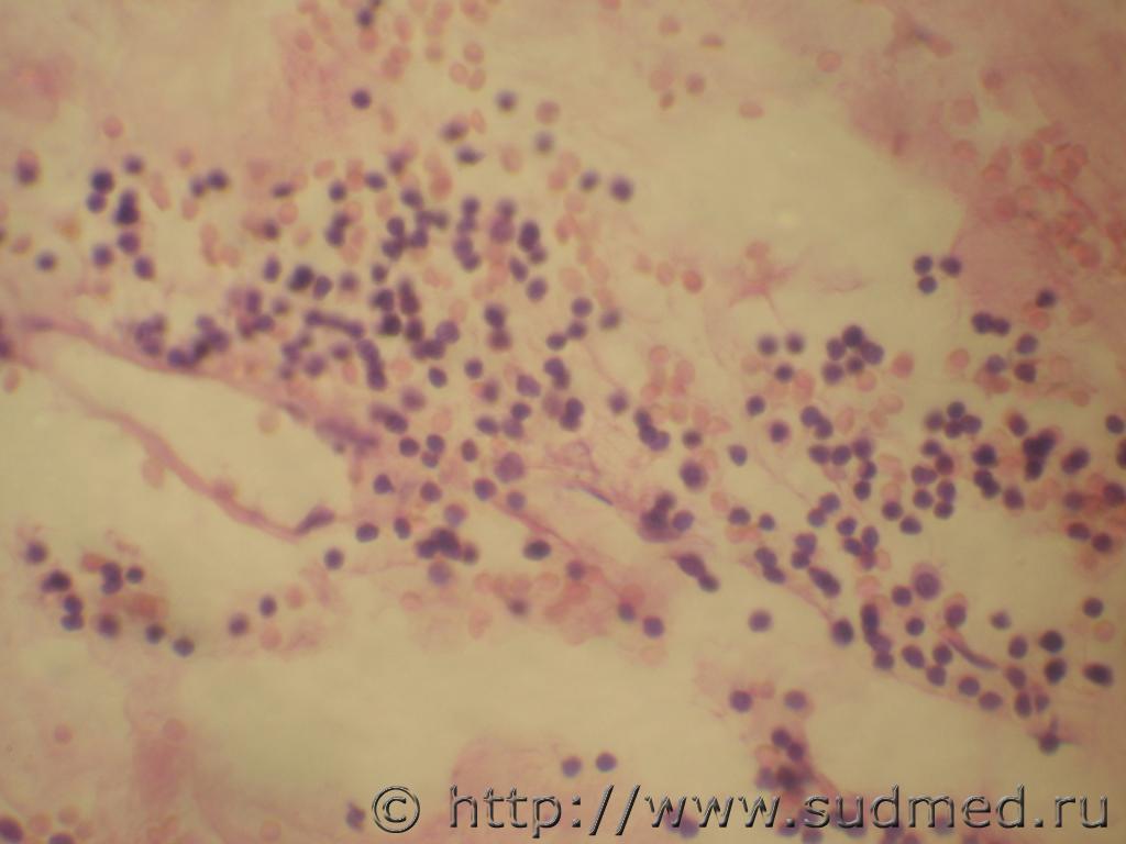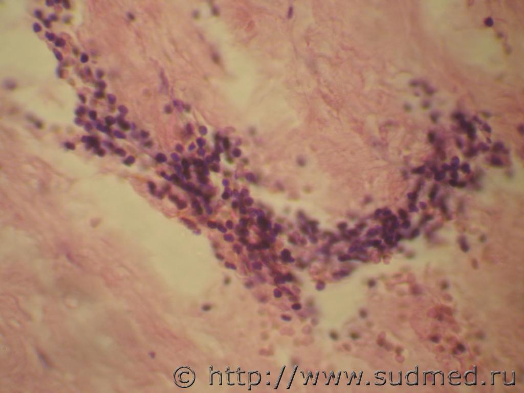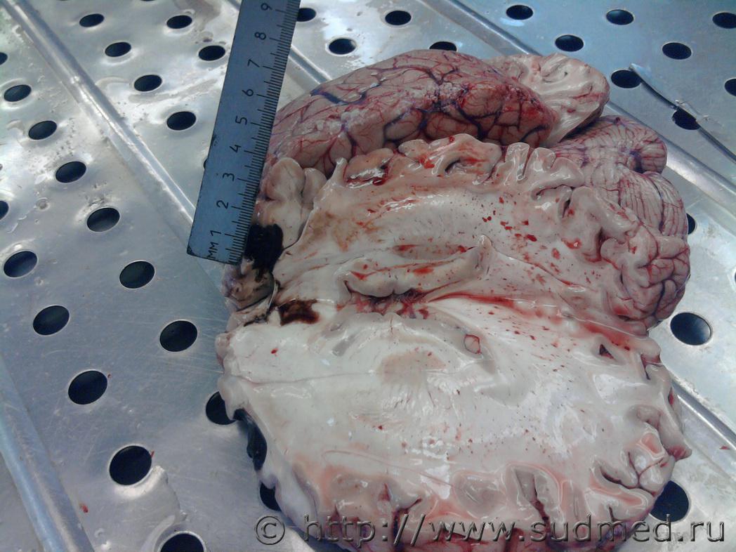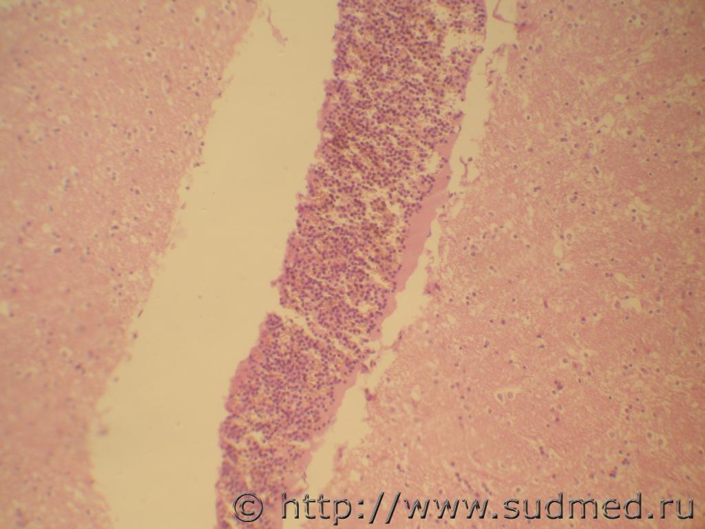 ....В левой лобно-теменной области отмечается гипо-изоденсивная зона серповидной формы,размерами 89х10х55мм. (объёмом 25см.3),наружный контур тесно прилежит к кости,внутренний-неровный.В структуре данной патологической зоны прослеживается мелкий очаг изоденсивный паренхиме мозга размерами 4-5мм.Заключение:субдуральная гематома в левом полушарии головного мозга в гипо-изоденсивной стадии (подострая). Исследование трупа.В левой теменной области твёрдая мозговая оболочка толщиной до 0,5см.на участке овальной формы размерами 8х5см.На разрезе видно,что внутренний и наружный листки здесь не соприкасаются между собой,на всём протяжении образуют серповидную полость,заполненную прозрачной студневидной жидкостью. При вскрытии трупа заподозрен хронический лимфолейкоз,который подтвердили родственники умершего и представленная ими меддокументация,а изменения твёрдой мозговой оболочки остались под вопросом. При гистологическом исследовании выявлена очаговая и диффузная лейкозная инфильтрация (лимфоцитарный опухолевый инфильтрат) твёрдой мозговой оболочки,что,на наш взгляд,могло послужить причиной расслоения её. Фото 1,2,3.Твёрдая мозговая оболочка. Фото 4.Кровеносный сосуд микроциркуляторного русла головного мозга с опухолевыми лимфоцитами. Эскизы прикрепленных изображений ![]() ![]() ![]() ![]() |