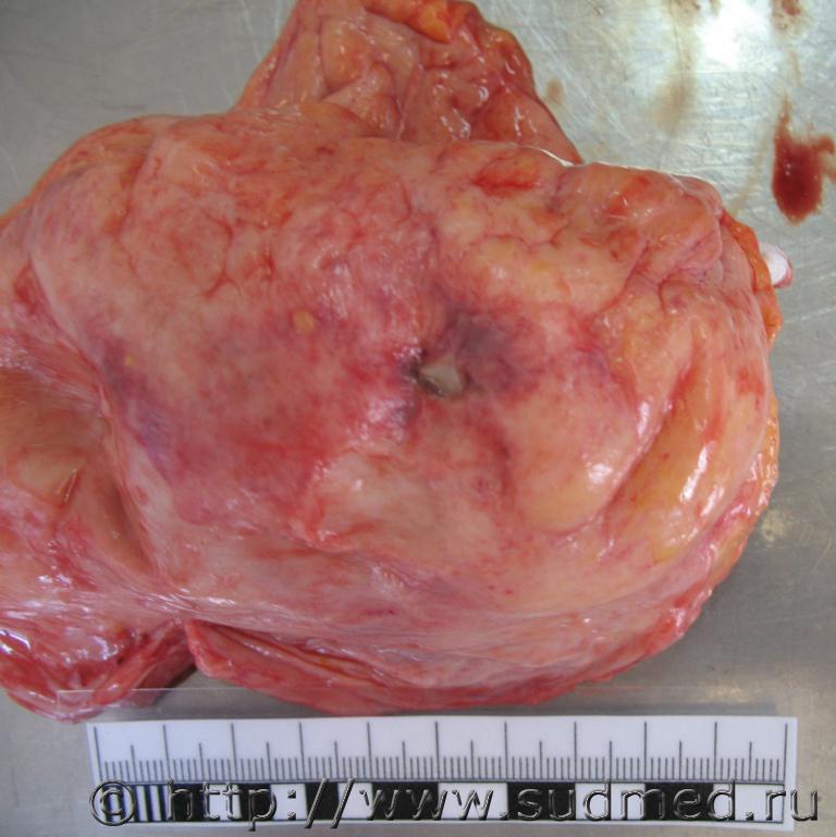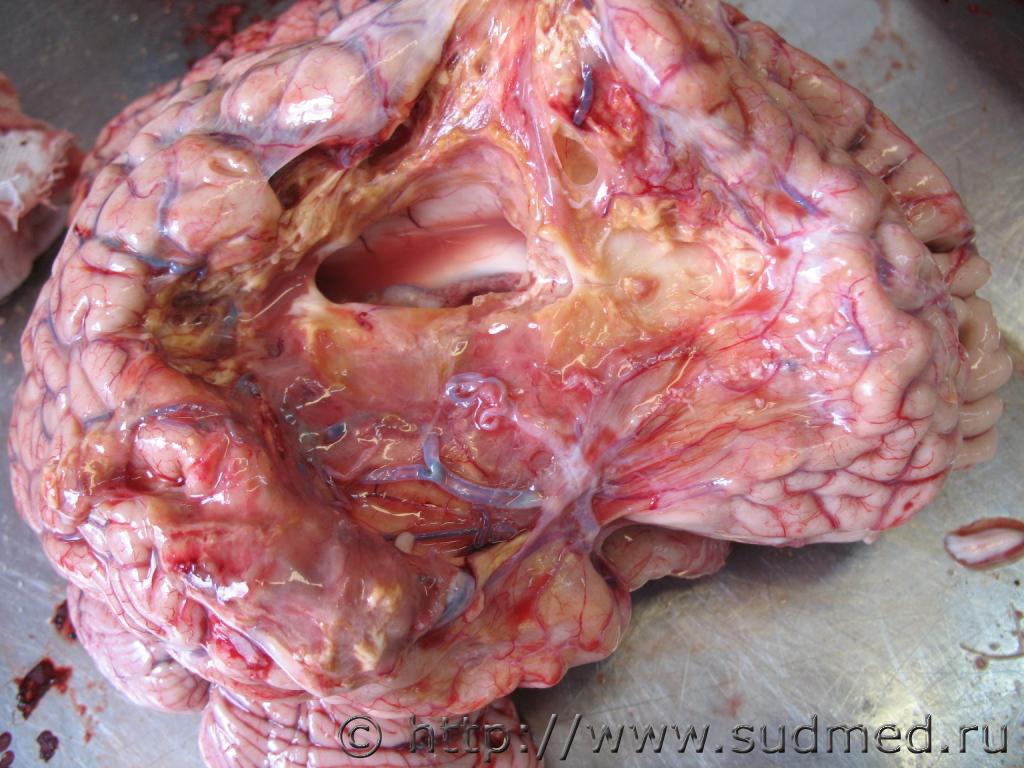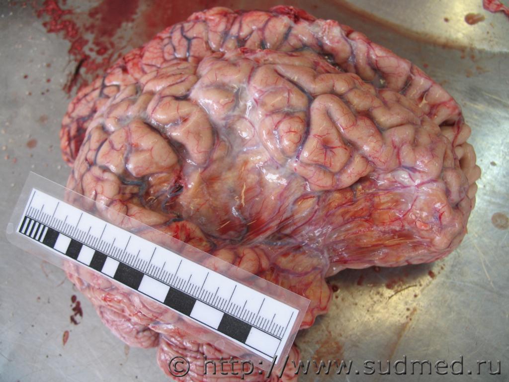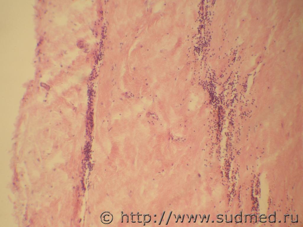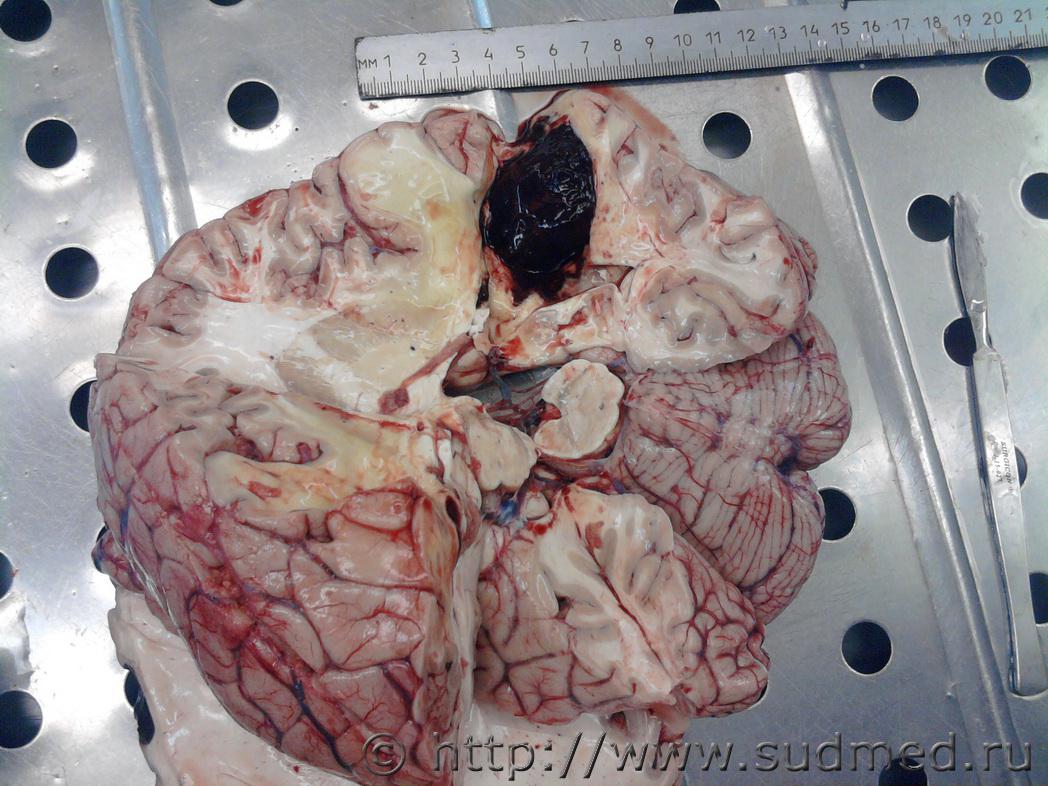 ....В левой лобно-теменной области отмечается гипо-изоденсивная зона серповидной формы,размерами 89х10х55мм. (объёмом 25см.3),наружный контур тесно прилежит к кости,внутренний-неровный.В структуре данной патологической зоны прослеживается мелкий очаг изоденсивный паренхиме мозга размерами 4-5мм.Заключение:субдуральная гематома в левом полушарии головного мозга в гипо-изоденсивной стадии (подострая). Исследование трупа.В левой теменной области твёрдая мозговая оболочка толщиной до 0,5см.на участке овальной формы размерами 8х5см.На разрезе видно,что внутренний и наружный листки здесь не соприкасаются между собой,на всём протяжении образуют серповидную полость,заполненную прозрачной студневидной жидкостью. При вскрытии трупа заподозрен хронический лимфолейкоз,который подтвердили родственники умершего и представленная ими меддокументация,а изменения твёрдой мозговой оболочки остались под вопросом. При гистологическом исследовании выявлена очаговая и диффузная лейкозная инфильтрация (лимфоцитарный опухолевый инфильтрат) твёрдой мозговой оболочки,что,на наш взгляд,могло послужить причиной расслоения её. Фото 1,2,3.Твёрдая мозговая оболочка. Фото 4.Кровеносный сосуд микроциркуляторного русла головного мозга с опухолевыми лимфоцитами. Эскизы прикрепленных изображений ![]() ![]() ![]() ![]() |