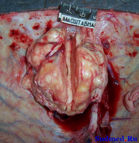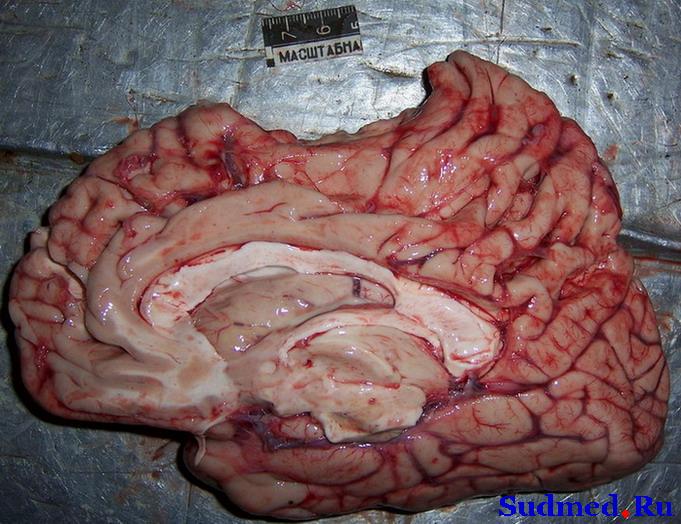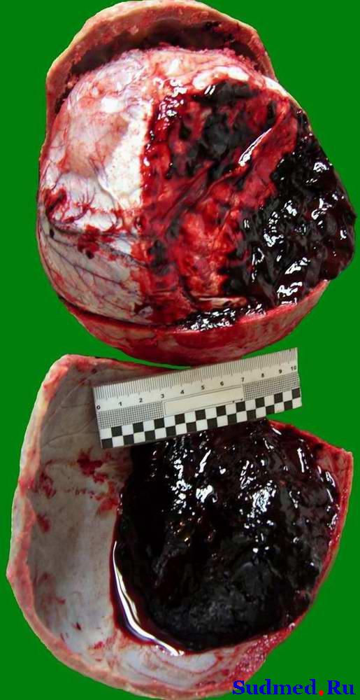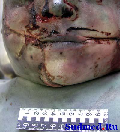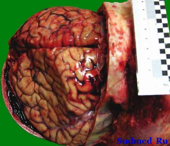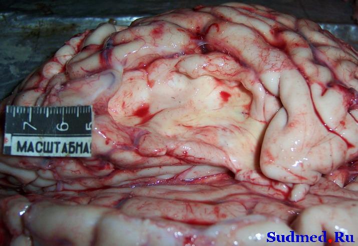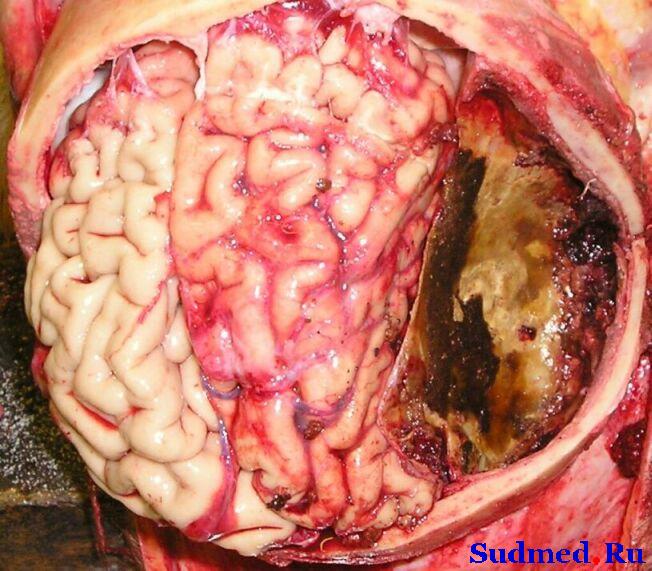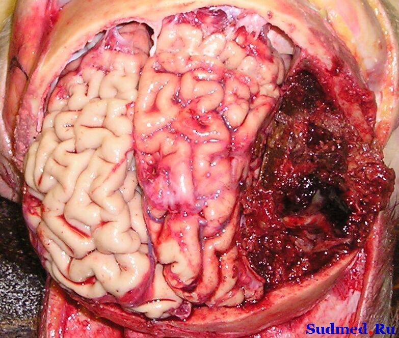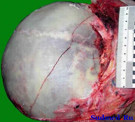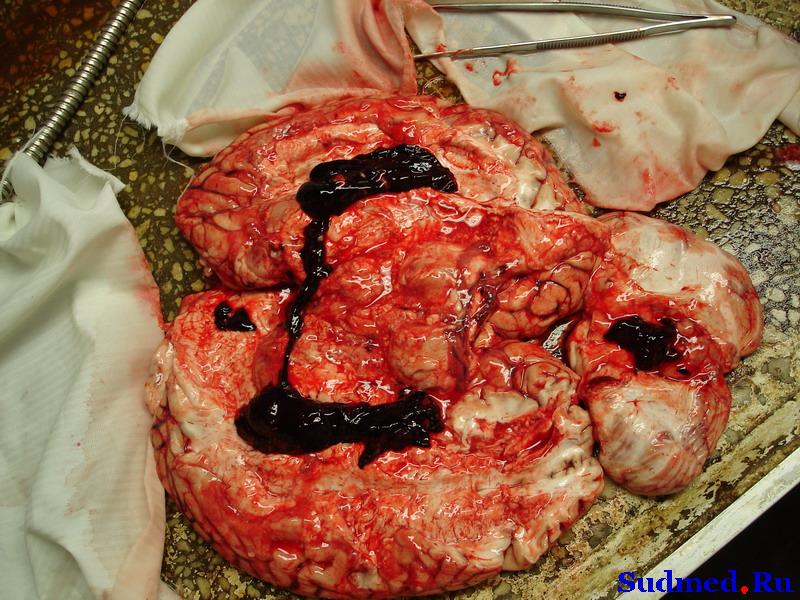 Вскрыл, на мой взгляд, интересную ЗЧМТ. Гр-н П. (социально дезадаптированный тип) был избит с 02.09. около 22 часов. В него бросили обломком кирпича, попали в лоб, а затем несколько раз пнули в голову. На длительное время терял сознание. Затем "очухался" и с помощью товарища добрался до дома.Как провёл ночь не ясно. 03.09. около 7 часов утра был ещё жив, хрипел. В 9 часов был обнаружен мёртвым. Со слов свидетелей, 02.09. днём его видели без каких-либо повреждений на лице. Повреждения на трупе: В лобной области рвано-ушибленная рана в пределах клетчатки. Вокруг правого глаза багрово-фиолетовый кровоподтёк с напряжённым отёком. В лобно-височной и височно-скуловой области справа небольшие ссадины. При вскрытии: кровоизлияния в мягкие ткани лобной области справа с переходом на правую параорбитальную клетчатку, в правую височную мышцу и в теменно-затылочной области справа.Остальное видно на фото. Если бы его достоверно избили 31-1, то всё было бы логичным и правильным. Но за 10 часов такая гематома и ишемическое размягчение продолговатого мозга образоваться не могут.На лицо случай повторной травматизации с приростом трещин по типу "конец в конец" и "конец в бок". А первая травма была 2-3 дня назад, воздействие в правую теменно-затылочную область, но свидетелей нет. Сам П. этот факт амнезировал. Так кажется... |
