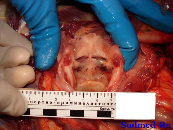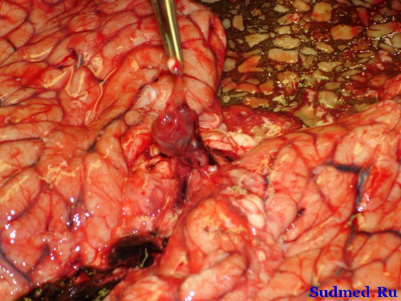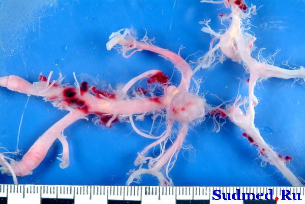 Спасибо, что поделились интересным наблюдением. Вторая фотография очень даже не плохая, но вот первая не очень. Вообще-то фотодокументация в судебной медицине, что научная, что экспертная это своеобразное инсценирование находки. Её надо в центр как-то выдвигать, а фон по возможности вычищять. Если Вы грязные тряпки и пинцет убрать не могли, то надо бы перед публикацией Вашего интересного во всех смыслах случая в мировой сети пообрезать края было, да и всё. Теперь по изображению. Если я правильно понял, и правильно вижу, то это свёртки крови в боковых желудочках. Прошу извинить если я не так вижу, но это опять же проблема фотографа. Хорошая иллюстрация не задаёт вопросы, а отвечает на них. Если Вы хотели показать свёртки в боковых желудочках, то на фото обязательно должен быть срез и стенка видны. Иначе всякие дотошные типа меня лишние вопросы задавать будут. И главный вопрос. Каким образом располагалась аневризма в области передней коммуникантной артерии если кровь в боковые желудочки прорвалась? Вот это самый интересный морфологический аспект Вашего случая. Я вообще не припомню спонтанно ни одного подобного случая у себя. Обычно в этом регионе аневризмы дают гигантские пластинчатые базальные кровоизлияния. Так что случай крайне редкий и морфологически интересный, не стандартный. Жаль, что Вы лишь рутинно его обработали. Поколдовали бы немного над находками и можно было бы даже стендовое сообщение по случаю сделать. Нам бы радость, а Вам почёт и публикация. Коллеги относитесь бережно к интересным казуистикам и документируйте их по всем правилам искусства! Если есть вопросы как, то можем обменяться каждый своим опытом где-то в соседней ветке. Чтобы не быть голословным выставляю свой похожий случай, но уже двухлетней давности. Если Вы обратите внимание на расположение внутренних сонных артерий, то поймёте почему прорыв в боковые желудочки произошёл. Во первых я редко препарирую вслепую (рентген с контрастом). Во вторых я обязательно на сосуды около получаса дополнительно к вскрытию трачу (рентген, препаровка, фото). У меня конечно и регтгенснимок этого случая с контрастом есть. Препарирую сосуды не "тупым" Немножко терпения и немножко опыта... Секретов никаких нет. Но у меня под этим особая психология. Меня просто наставники научили морфологическую находку уважать и любить. Если Вы находку любите, то и относитесь к ней соответственно. Я трупы, в принципе, не люблю, но вскрываю охотно потому что сильно чуда жду. Чудо это когда что-то редкое и особенное попадается. У меня через это ожидание маленького чуда вся мотивация на профессию идёт. Иначе запил бы наверное или бросил это в прямом смысле гнилое занятие. Издержки правда тоже есть. Вскрытия у меня долгие, а винчестеры уже все фотографиями переполнены до предела. А секретов и правда никаких нет. |