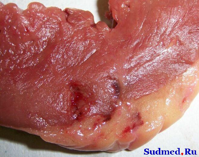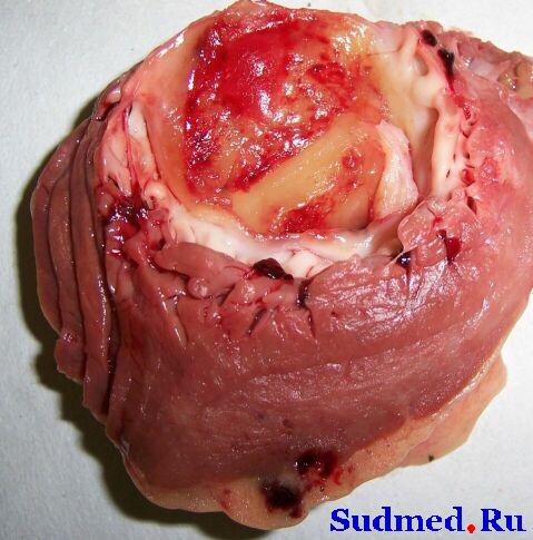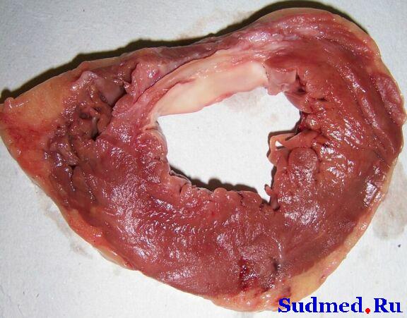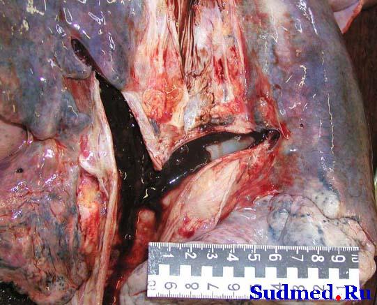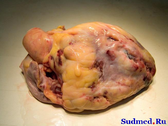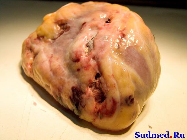 У меня вчера - тоже сердце (и то же без масштаба). М., 70 лет. Рак recrum с массивными метастазами в легкие ("нафаршированы"). Одиночный выстрел в грудную клетку из двуствольного ружья. Входная рана по левой среднеключичной линии в 4-м межреберьи; выходная - по задней подмышечной на таком же горизонтальном уровне. Раневой канал распространяется через левую плевральную полость с повреждением нижней доли легкого. Пневмоторакса и гемоторакса нет из-за полной облитерации плевральной полости. Наружное кровотечение небольшое. Смерть на МП (точное время переживания не известно, но измеряется либо минутами, либо десятками минут; судя по следам крови после выстрела тело не перемещалось). Перикард не поврежден. В клетчатке переднего средостения кровоизлияний нет. В полости сердечной сорочки крови нет. В миокарде, в области верхушки и передней стенки - единичные крупноточечные кровоизлияния. Вывод о причине смерти - острая сердечная недостаточность в следствии ушиба сердца, вызванного огнестрельным ранением грудной клетки. (Микропрепаратов не будет - у гистологов нет нужного оборудования). |