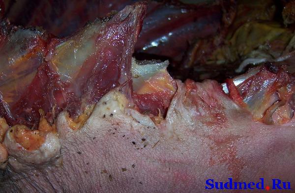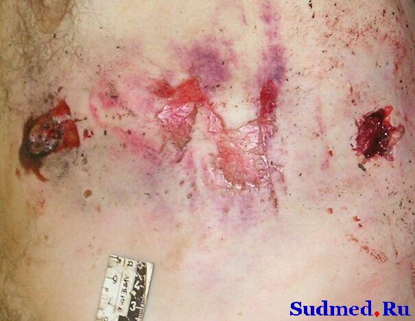 Сссадины на передне-вутренней поверхности верхней трети бедер и рваная рана на половом члене.