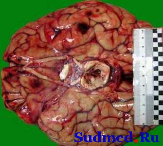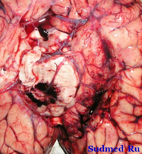 М., 43 лет был изюбит. Смерть в стационаре в тот же день. На вскрытии - субдуральная гематома (170 г свертков и жидкой крови), а в области ММО - "выпячивание" конгломерата сосудов, очаговое САК и разрыв оболочки в этой области. Патогистологически - артерио-венозная мальформация. Дано заключение о не травматической природе субдуральной гематомы. |