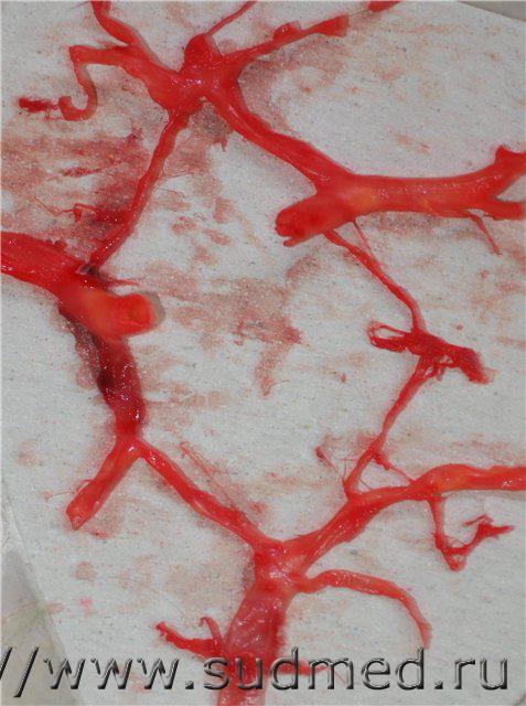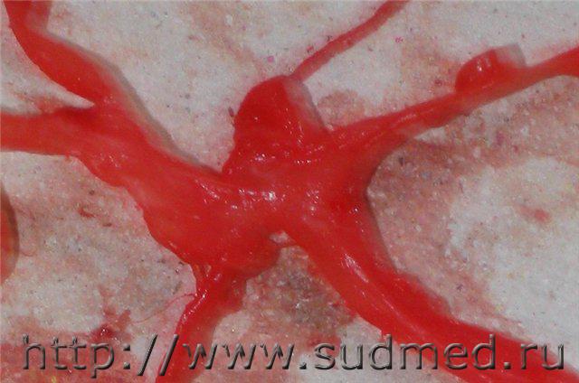 Слизистая Пищевода и ЖКТ бледная без очаговых изменений, из фатерова соска кровь со свертками, как и в протоках ПЖЖ при промывании проточной выделение крови осталось только из одного протока, при нагнетении подкрашеного бальзамирующего раствора в чревный ствол и затем последовательно в правую желудочно-сальниковую артерию выделение раствора из этого протока. В артерии выявлена аневризма со слоистым пристеночным тромбом и жидкой кровью, вершина аневризмы соответствует описанному протоку ПЖЖ. В ПЖЖ резко выраженный фиброз с кальцинозом и множественные не сообщающиеся кисты диаметром до 14см Каких либо характерных для муковисцедоза признаков в других органах нет центральный проток ПЖЖ после промывания с сохранившимися свертками крови в области фатерова сосочка в рассеченном продольно холедохе видна прозрачная желчь ![]() аневризма со стороны протока ПЖЖ ![]() аневризма со стороны сосуда - видны закругленные края "ворот" аневризмы ![]() |