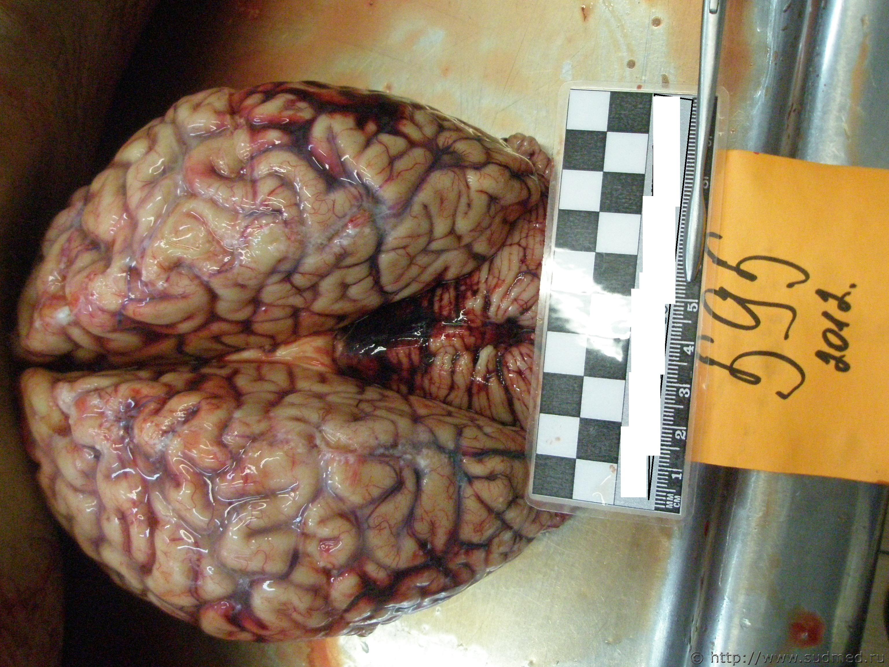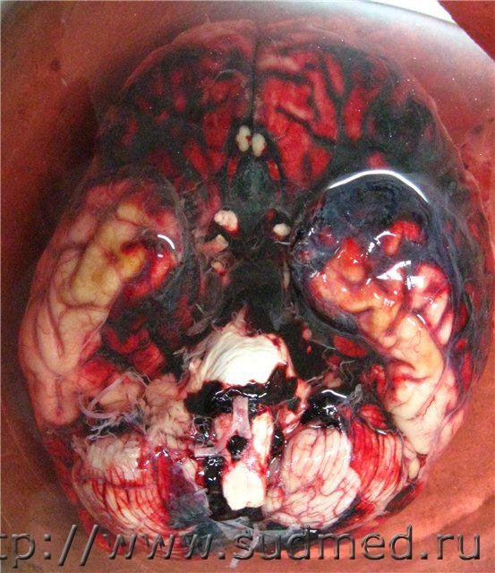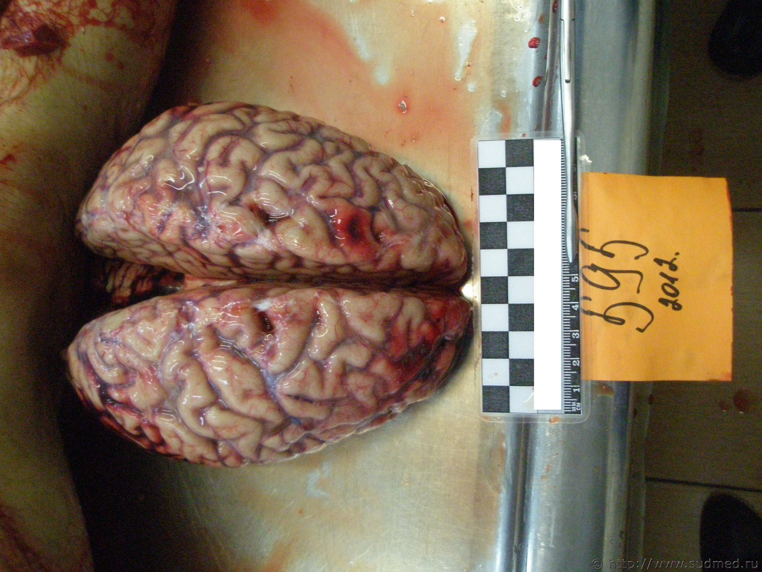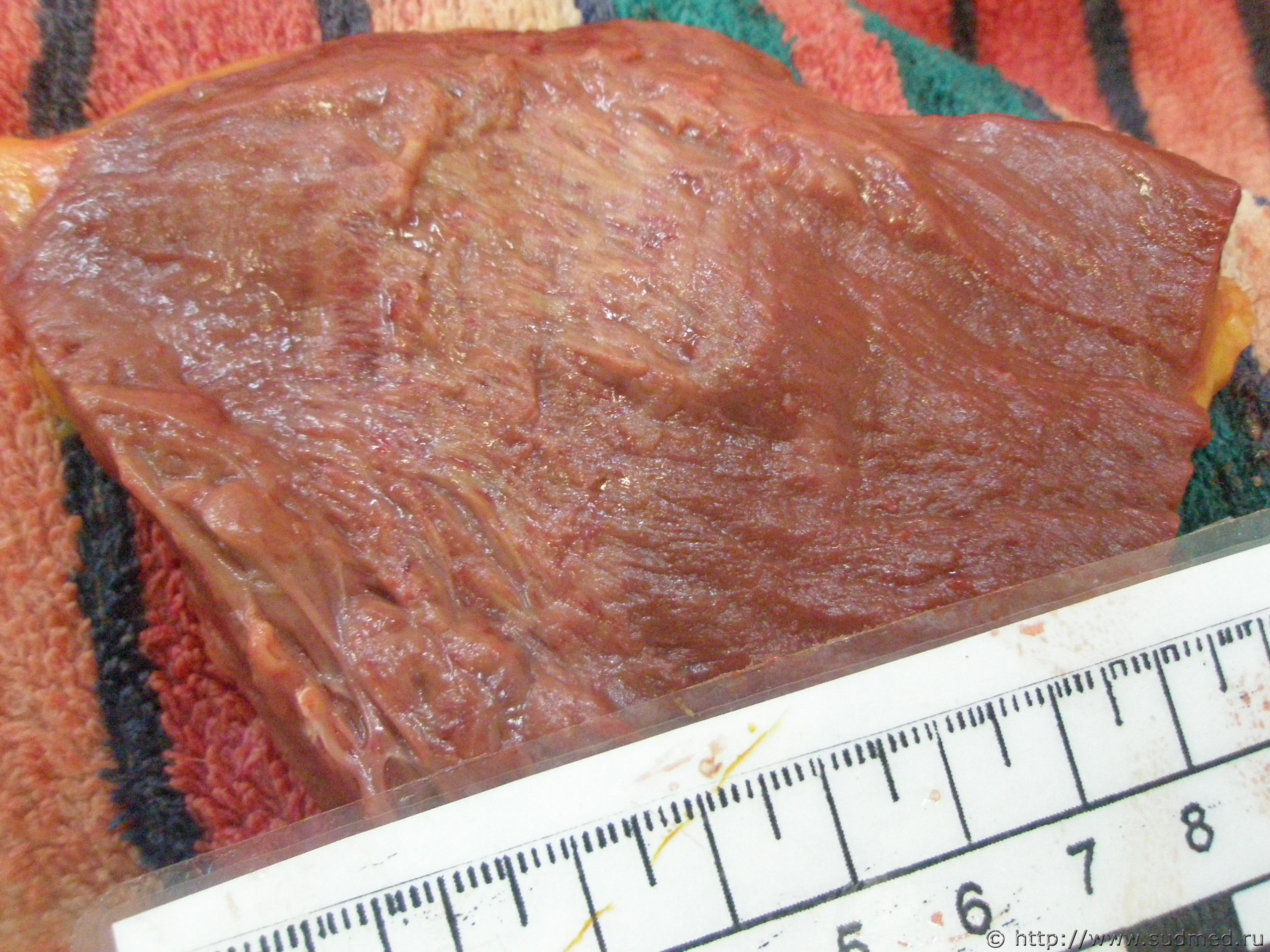 Под твердой оболочкой бесцветный ликвор и капсулированая СДГ гематома 16г, давностью 4года, которая относительно легко снялась с внутренней поверхности ТМО в виде мешочка 12х4х0,5см. в её проекции неравномерное истончение серого вещества коры по вершинам извилин с выраженной дрябловатостью их белого вещества на глубину до 1см, без заметного буроватого оттенка. Других очаговых изменений нет. Кровь в гематоме преимущественно жидкая, что видно на снимке при вертикальном положении гематомы, с наличием мелких темно-красных свертков крови на внутренней поверхности. При получении гистологии добавлю микрокартину гематомы и коры, так как интересен вопрос А всели эритроциты будут с гемолизом ![]() ![]() Со слов родственников за 4 года до смерти инсульт с нарушением речи Перед смертью нарастающая одышка амбулаторно ХИБС. Смерть от ОССН (отек легких) развившейся в в результате постинфарктного кардиосклероза с признаками хронической ССН |