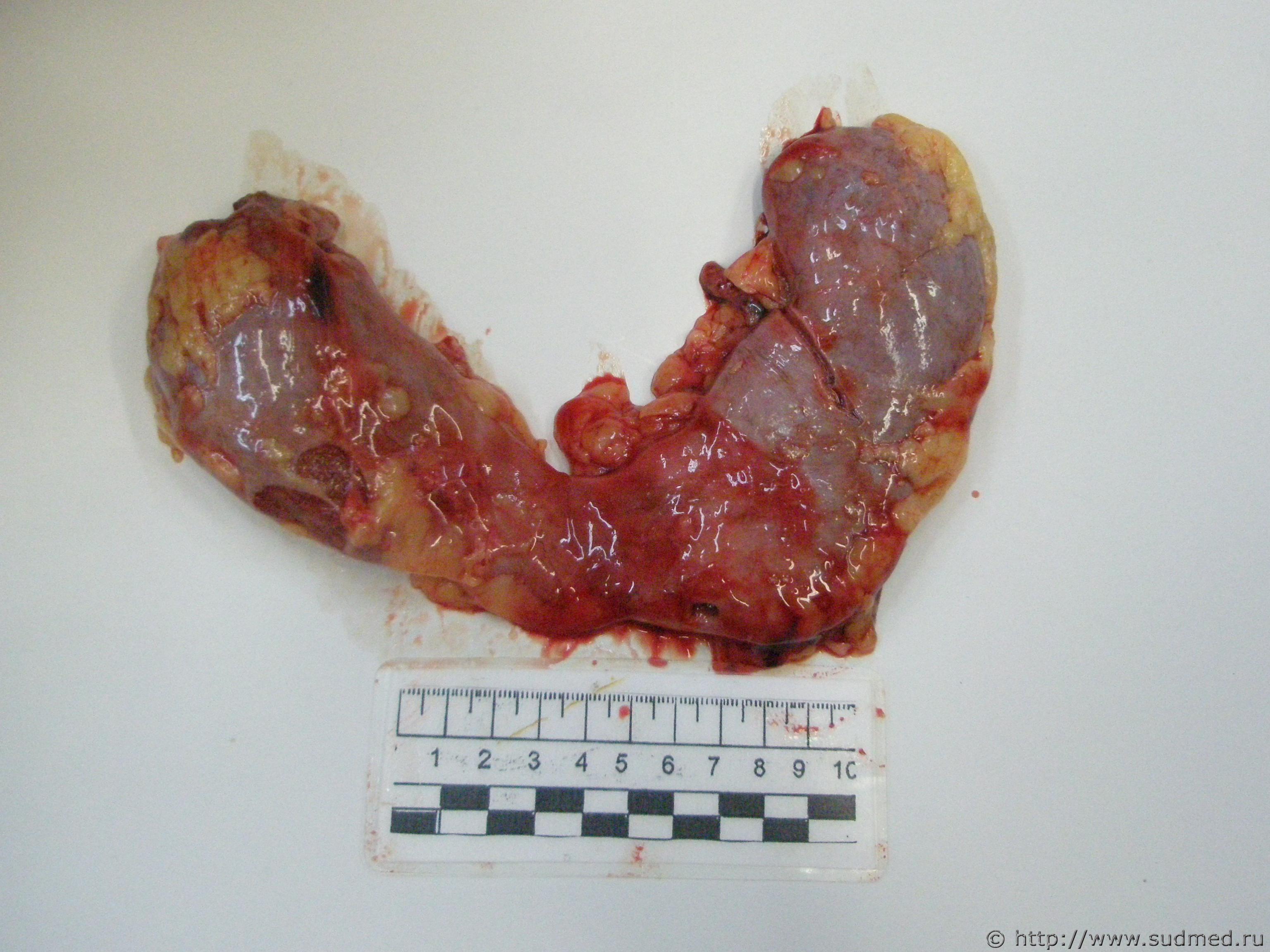 Сегодня исследовал Хронический панкреатит с вероятно аррозивной аневризмой (диамертом 3см) правой желудочно-сальниковой артерии с разрывом аневризмы в проток поджелудочной железы с массивным ЖКК -> смерть от острого малокровия, жидкая кровь в желудке и на всем протяжении тонкого и толстого кишечника со свертками свертки крови в виде слепков в начальных отделах тощей кишки