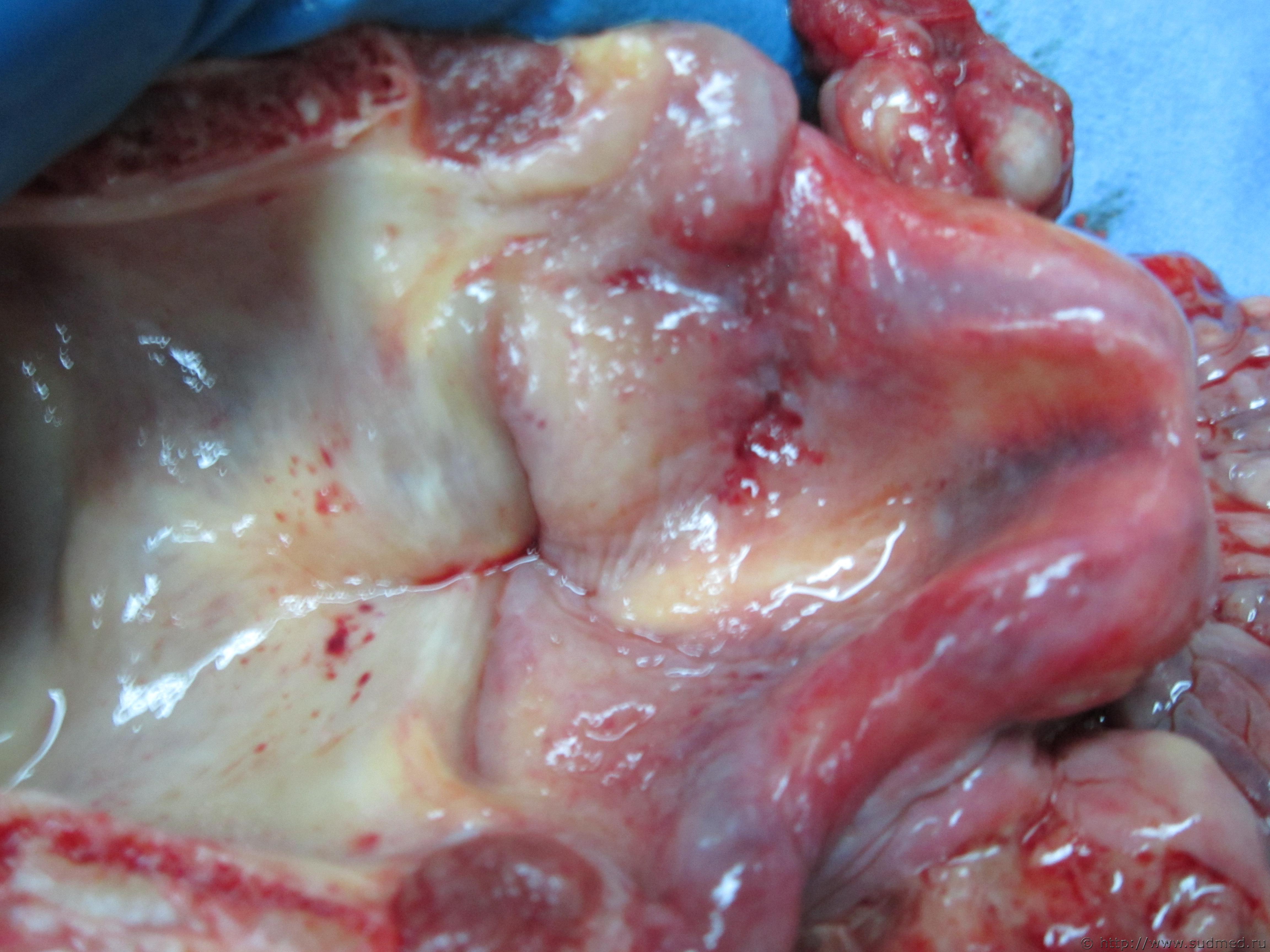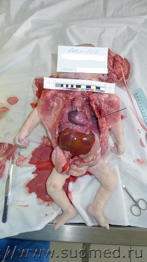 -низкий скошенный лоб, суженные глазные щели, расстояние между которыми уменьшено, запавшая переносица, широкое основание носа, расщелина нёба, полидактилия, короткая шея, колобома правого глазного яблока, микрофтальмия и катаракта левого глазного яблока. -Тетрада Фалло – дефект межжелудочковой и межпредсердной перегородки, стеноз легочной артерии, гипертрофия левого и правого желудочков, декстрапозиция аорты. -нарушение развития всех отделов ЦНС, гипоплазия мозолистого тела, микроцефалия. -фиброкистозные изменения поджелудочной железы, добавочные селезенки (4), добавочные доли печени (4), добавочный червеобразный отросток, эмбриональная диафрагмальная грыжа. -добавочные доли правого и левого легкого, ателектаз долей правого и левого легкого. -двурогая матка. Стрелочкой отмечена селезенка в левой плевральной полости. Синдром был диагностирован на втором скрининге, но мать решила сохранить беременность, месяц после рождения ребенок провел в ГНЦ. Выписался на зондовом питании и с постоянной подачей кислорода. Непосредственная причина смерти сердечно-сосудистая недостаточность, стеноз ЛА. С ув. Эскизы прикрепленных изображений ![]() ![]() |
