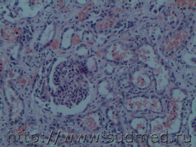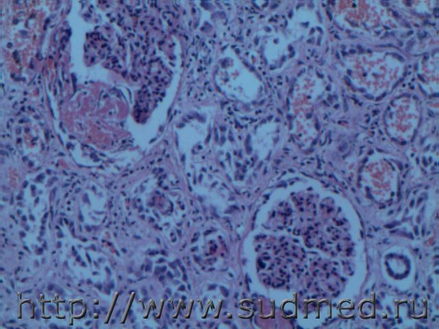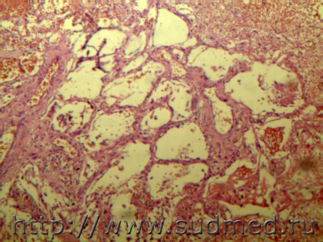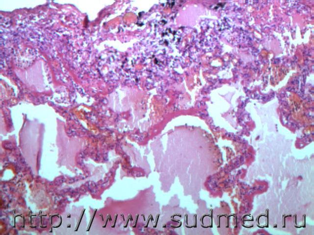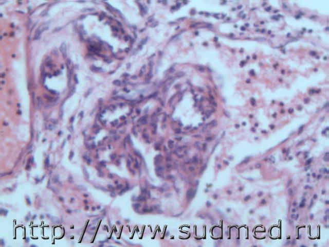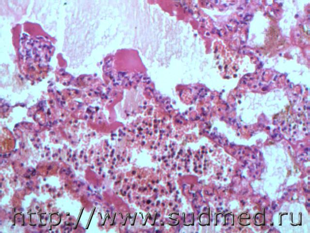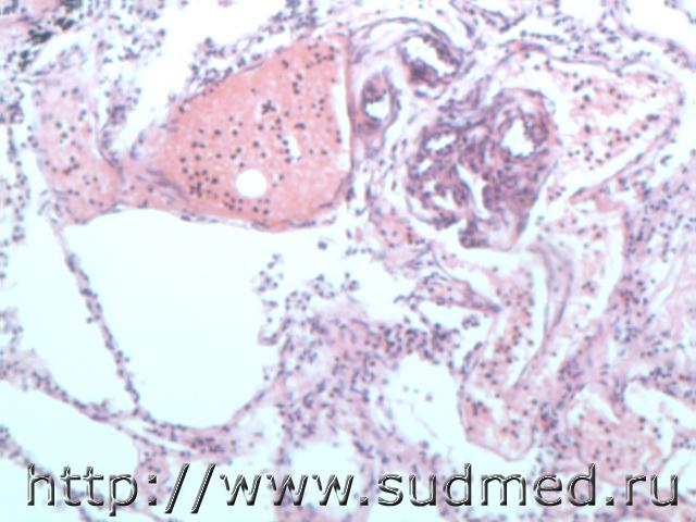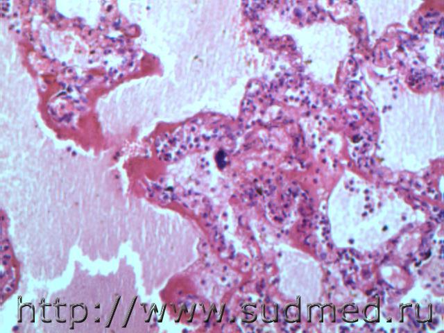 ОВБИ,молниеносная форма. Болезнь гиалиновых мембран у взрослого(44 года), в сосудах единичные мегакариоциты,лейкоцитоз.