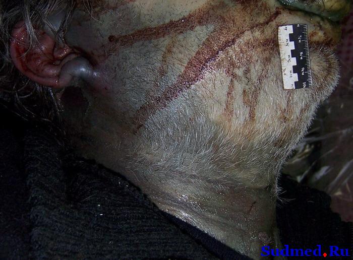 Уважаемые коллеги. Ситуация такая: выезжаю на МП, изрядно подгнивший труп мужчины лежит на улице. Следы волочения от дома. Осматриваю; на коже шеи, в верхней трети некое подобие странгуляционной борозды (см. фото). Потом обнаружили паспорт: вот его прижизненная фотография. И стало спокойнее. Складки на шее при жизни имеют практически ту же локализацию, что и на трупе. На вскрытии признаков сдавления органов шеи не обнаружено. ![]() ![]() ![]() |