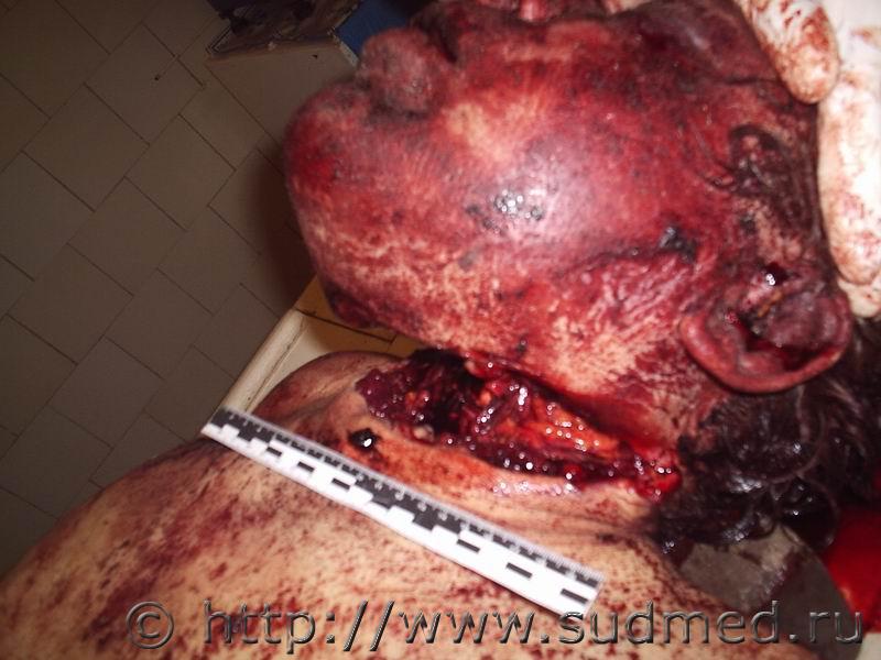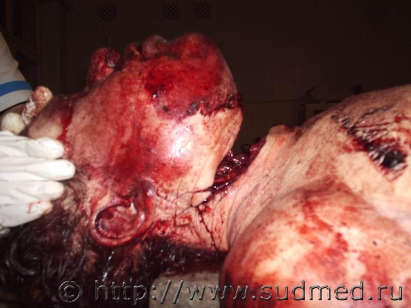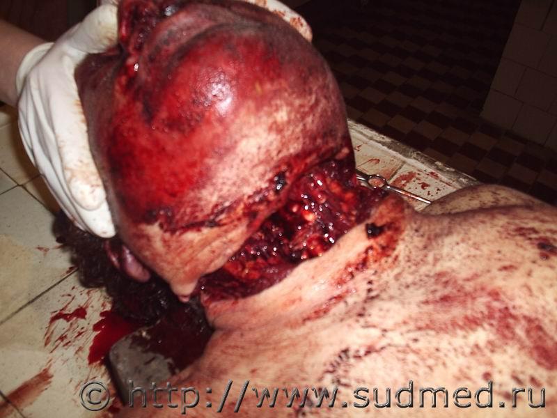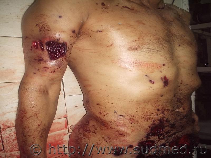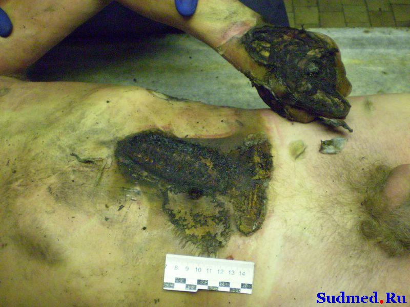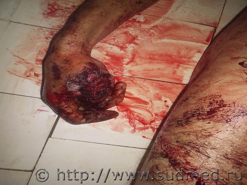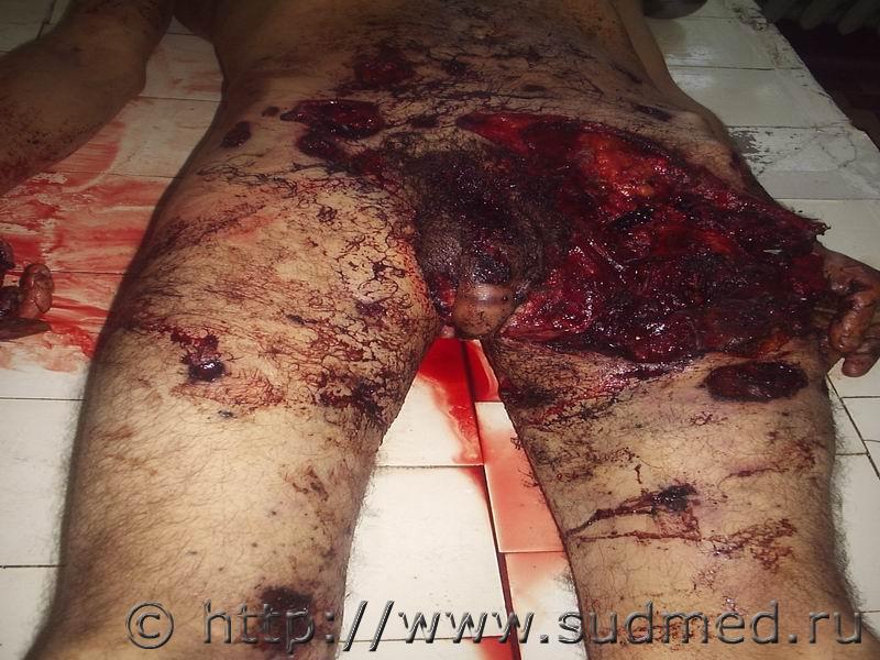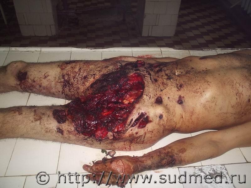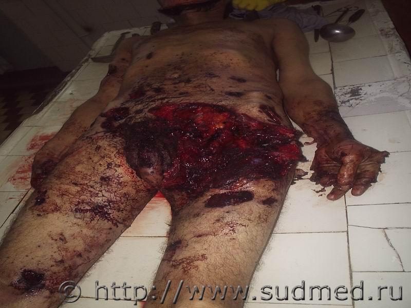 Вот еще случай. Повреждения причиненные животными. В данном случае разбушевавшийся бык из стада коров убил пастуха-молодую щенщину. Дело было в открытом поле, спрятаться некуда. Бык наносил неоднократные удары рогами и копытами, подбрасывал вверх, отбрасывал в сторону. Причина смерти: Сочетанная травма. Закрытая тупая травма грудной клетки с множественными переломами ребер справа и слева Разрыви отбеих легких. Закрытая тупая травма брюшной полости с множественными разрывами печени, селезенки, петель тонкого кишечника. Массивная внутригрудная и внутрибрюшная кровопотеря. ![]() ![]() ![]() ![]() ![]() Взрывная травма. Сварщик резал металлолом с завода по производству гексогена и тротилла. В частности резал трубы со старых весов, на которых взвешивались данные взрывчатые вещества. За много лет в корпусе весов и в частности в полости труп попало большое количество взрывоопасной пыли, а это никто не мог предвидеть, весы сдали на металлолом и когда сварщик присев возле них стал резать автогеном, произошел взрыв. ![]() ![]() ![]() ![]() ![]() |