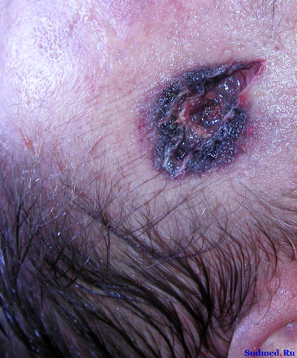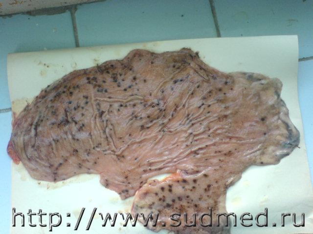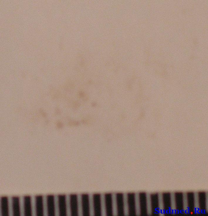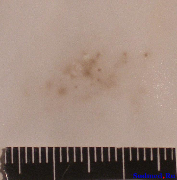 Помещаю две контактограммы (свинец) одного и того же кожного лоскута с входной огнестрельной пулевой раной (по всей вероятности выстрел проводили кустарным патроном.) На первом фото - контактограмма до погружения в раствор Ратневского (свинца мало), а вторая – после 4-х дневного его пребывания в растворе (свинца стало больше). ![]() ![]() |