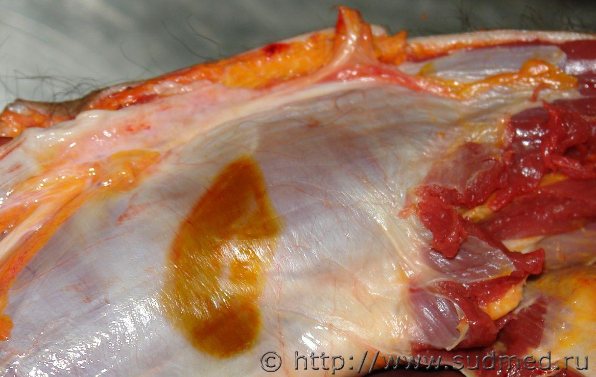 Мужчина ушел из-дому в районе 10 февраля, найден на поле, вокруг ничего не обнаружено. Голова как видите, мозг - каша. Лежал на спине, верхняя одежда не повреждена, задрата кверху. По всей видимости подвергался воздействию животных и (или) птиц. Меня смущает кожа на грудной клетке и животе, да и ее участки на шее. Тускло желто-красноватая, пергаментной плотности, истончена. Отверстия, которые видны на гр кл справа (их четыре) максимальное размерами 2,4х2,1 см, минимальное 1,5х1,2 см, края их истончены. Под ними, начиная от 3 по 6 ребро, от окологрудинной линии до, несколько кнаружи от среднеключичной, на участке 12х9 см, фрагменты ребер отсутствуют, один из них в полости гр кл, края их зубчастые. Также выявлены переломы с той же стороны 5 и 6 ребер по передней подмышечной линии(непрямые). Внутренние органы гнилые, повреждений не обнаружено, правое легкое спавшее, под дефектами ребер ткань легкого темно-серо-красная.Злева в 5 м межреберье кровоизлияние 1,6х1,2 см. Обнаружили 22-23 марта, местность-чистое поле, никаких следов вокруг нет, в полости гр клетки только один фрагмент ребра, остальные фрагменты с вышеописаного участка отсутствуют, о сосотоянии пристеночной плевры в даной области вопрос думаю отпадает, но два ребра ниже (описано выше) сломаны, гистологии пока нет. Отверстия думаю проделали птицы, если бы рога, было бы повреждено легкое, а так со стороны дефектов оно целое. Повреждения все-таки скорее от действия местной фауны. ![]() |