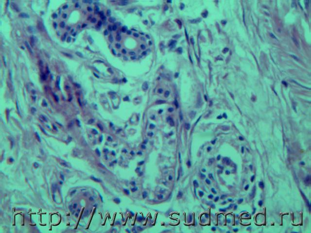 Гнойный мастит с образованием кист и гранулем с многоядерным гигантскими клетками по типу инородных тел