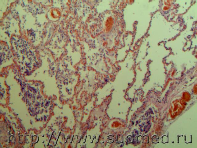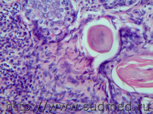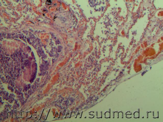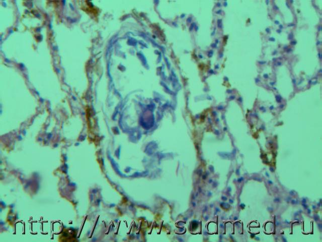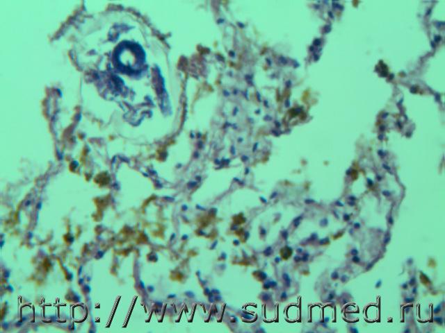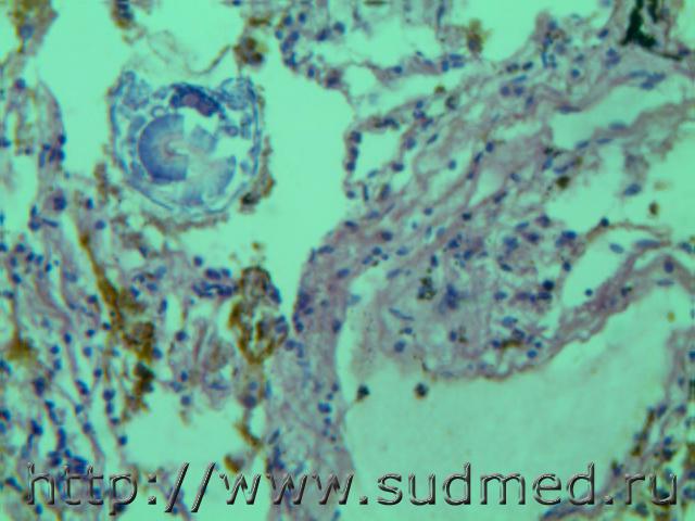 В просвете альвеол грибково-паразитарное тело?!( м.б. артефактные черви)при сепсисе(апостоматозные очажки во внутренних органах).