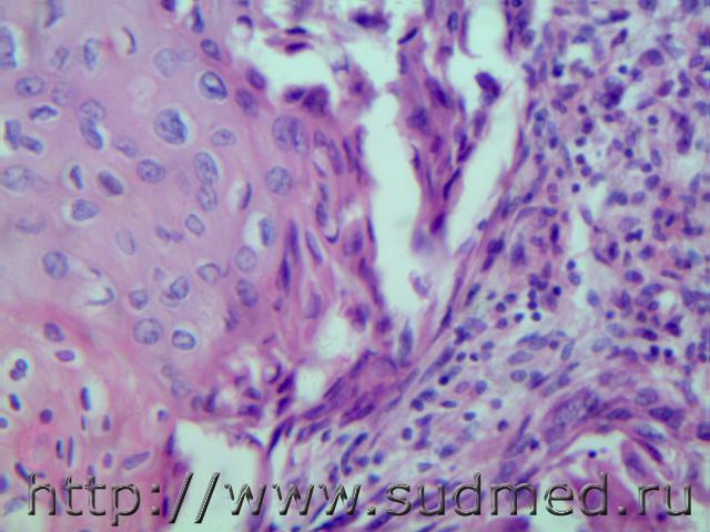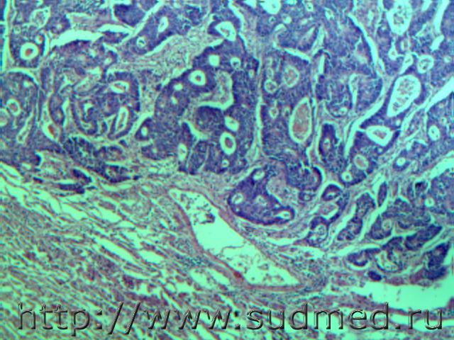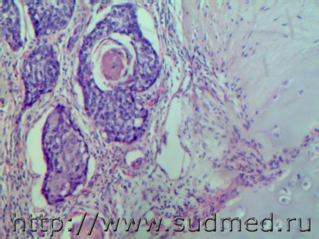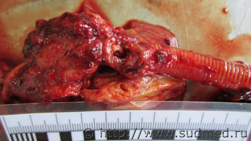 Мукоэпидермоидный рак слюнной железы ( или плоскоклеточный ороговевающий)с прорастанием в гортань, пищевод.