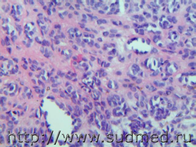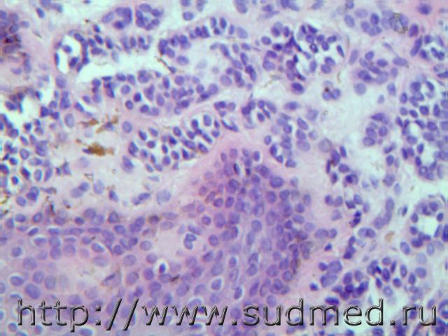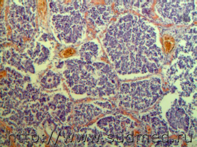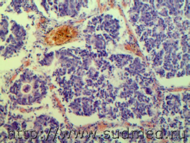 Карциноид( серотонин синтезирующий) поджелудочной железы с метастазами в легкие и печень(аденомоподобные псевдорозетки с наличием в просвете базофильной массы), мужчина 62 лет.