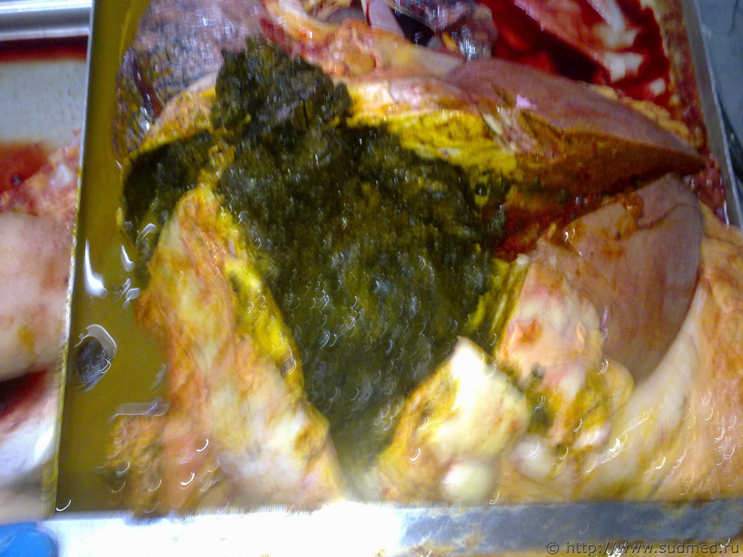 Эхинококк печени с хитиновой оболочкой, кальцинизацией и в просвете кристаллики золотистого цвета желчного генеза(макро диаметром 1.2/2 см., округлой формы, стенка местами плотноватая, на разрезе в полости конкременты)
