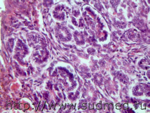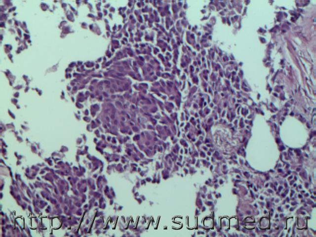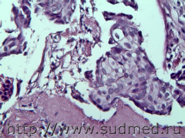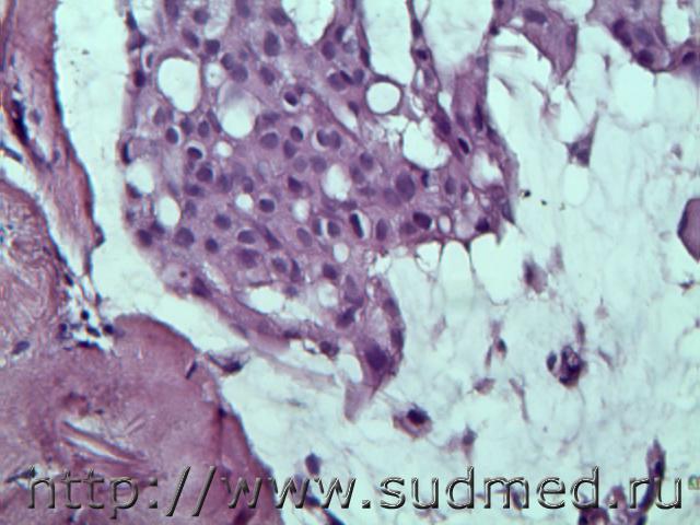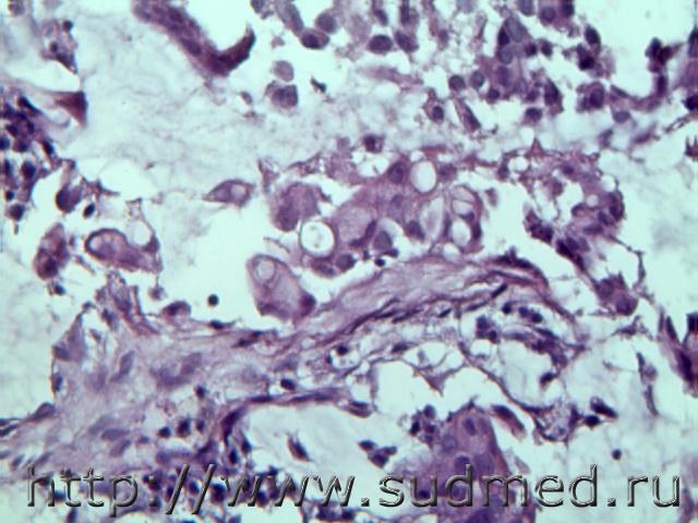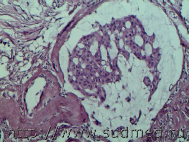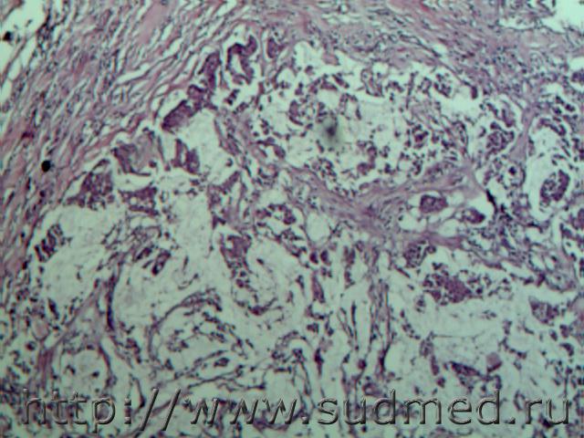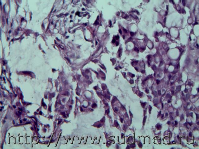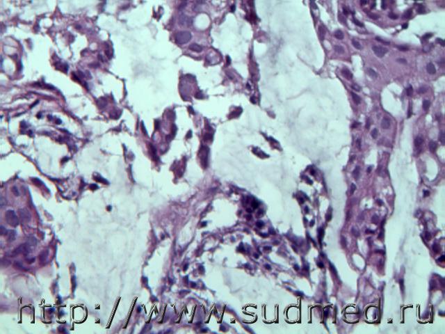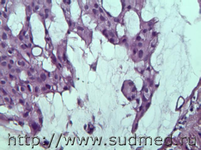Слизистый рак(карцинома) молочной железы с плоскоклеточной метаплазией( опухолевые клетки в слизистой основе, клетки с вакуолизацией, эмболизацией сосудов(биопсия после серийного среза той же карциномы в сообщении 697).