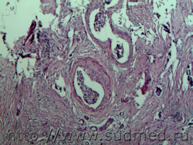 Гуммозный мезаортит, расслоение,аневризма, разрыв стенки и кровоизлияние( плазматические клетки, мукоидная дезорганизация коллагеновых волокон и.т.)