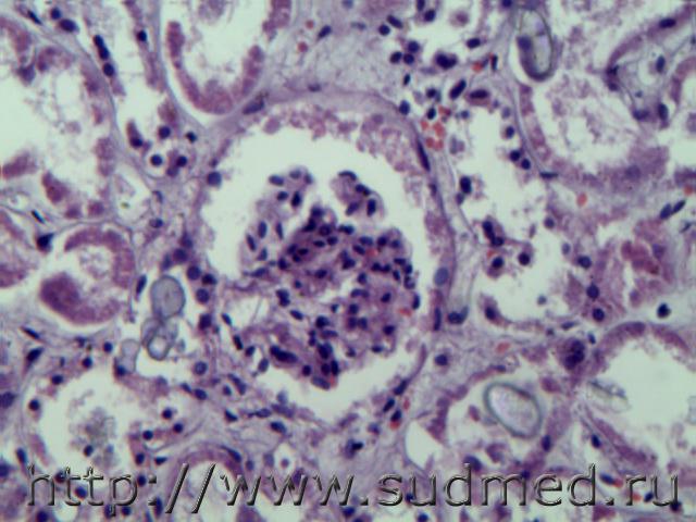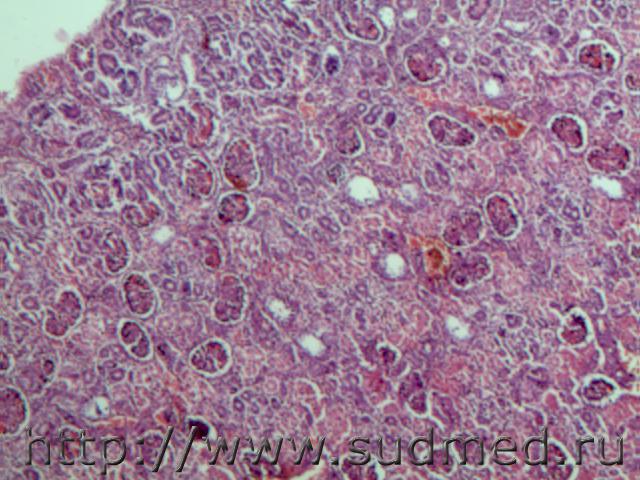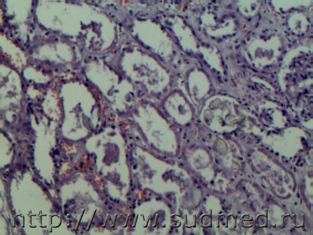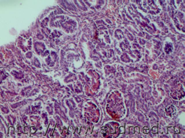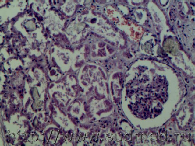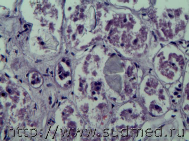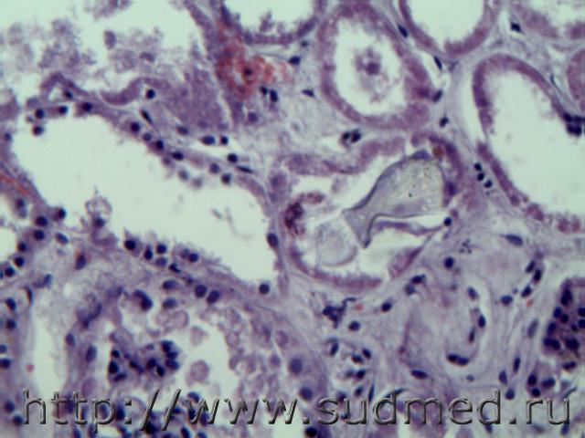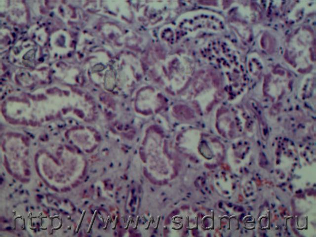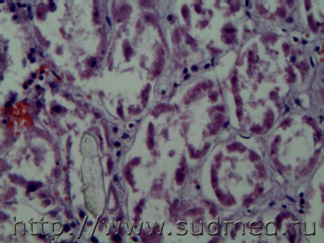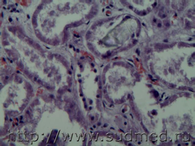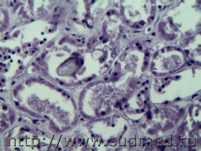 Отравление антифризом(этиленгликоль).)Кристаллики оксилата кальция в просвете канальцев почки(прозрачные бесцветные кристаллики).Некронефроз.