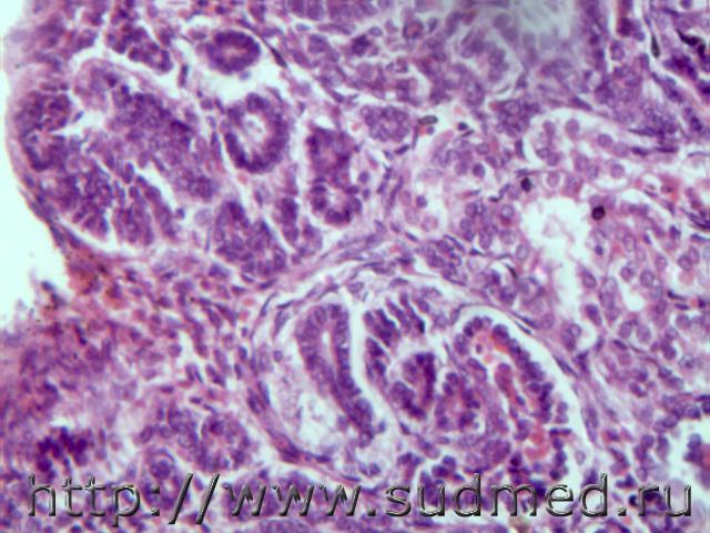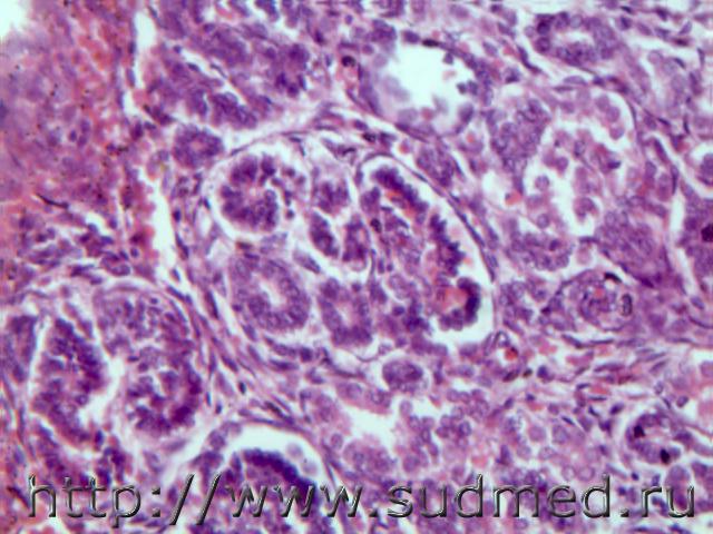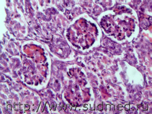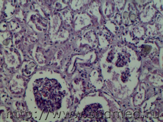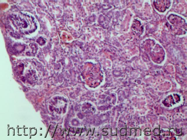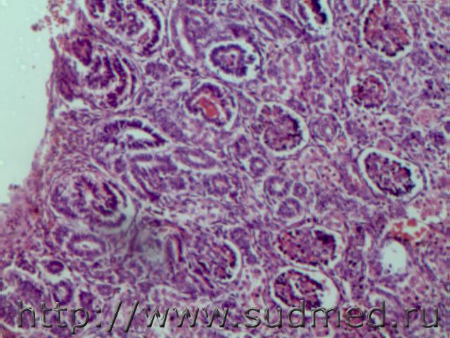 Незрелость почки: субкапсулярные примитивные клубочки- если 3 слоя к 22нед., 2 слоя к 26 нед.,1 слой к 34 недельному сроку внутриутробного развития соответствует. А вообще гломерулогенез заканчивается к 36 недель в/у. Здесь 2 слоя т.е. равно к 26 недель в/у сроку развития.
