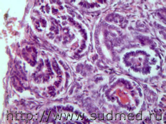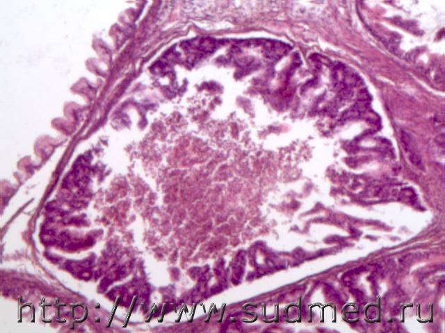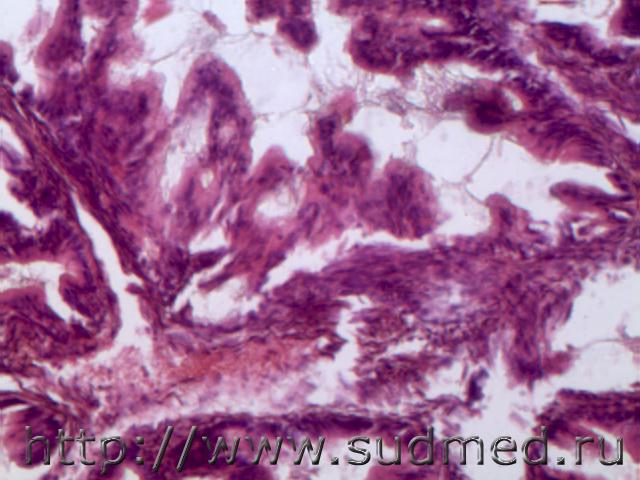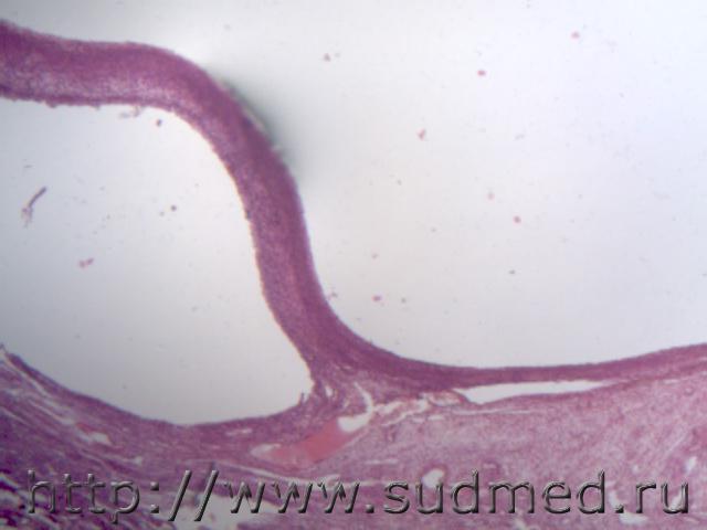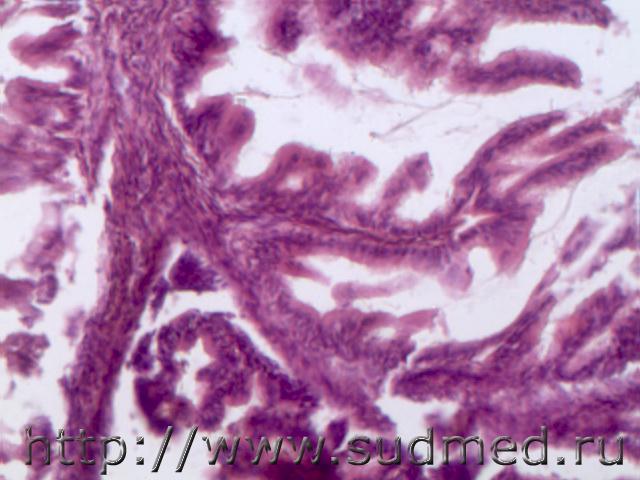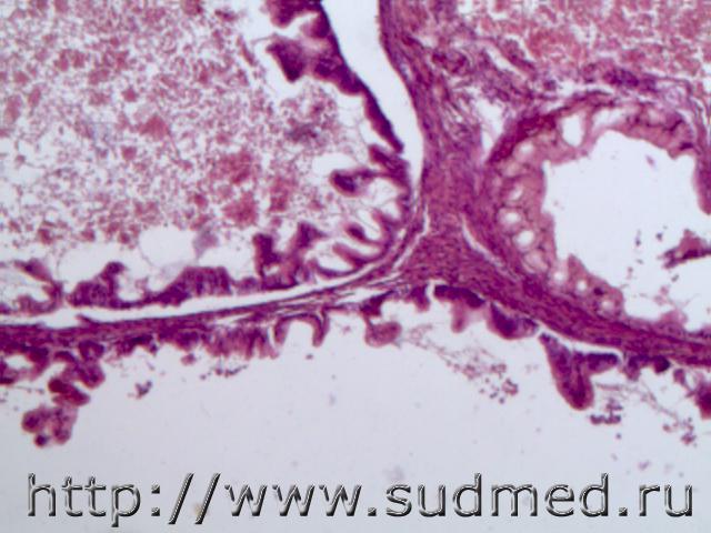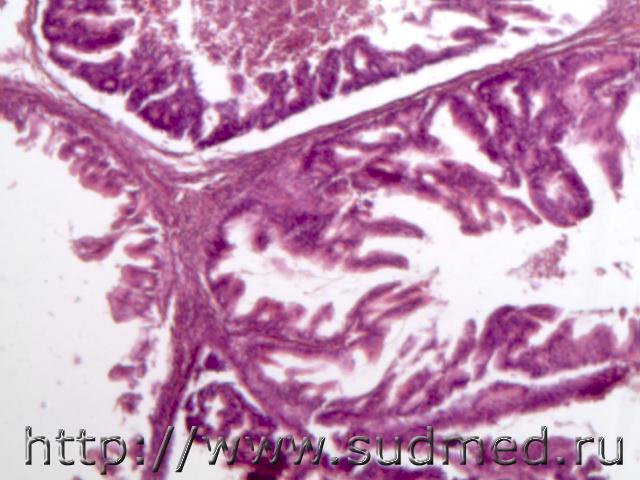 Пролиферирующая муцинозная киста яичника, желтое тело с кровоизлиянием, фолликулярные мелкие кисты( операционный материал)