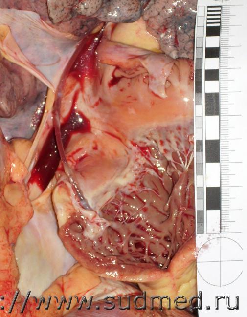 Катетер в просвете правой подключичной, верхней полой вены, правом предсердии и желудочке (между передней и задней створками 3-х-створки), срезан при удалении за 2 года до смерти, концы эндотелизированы.
