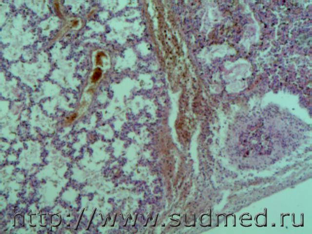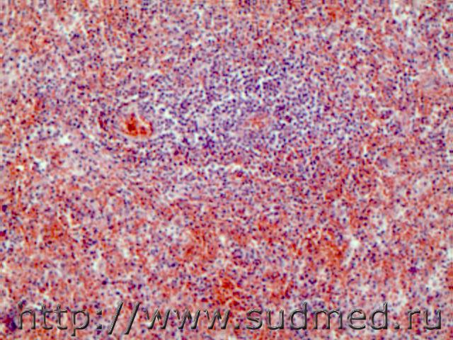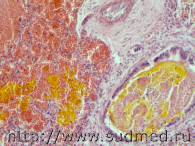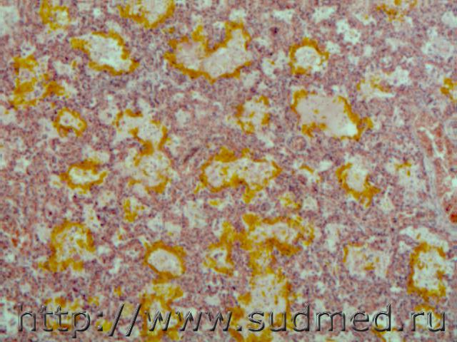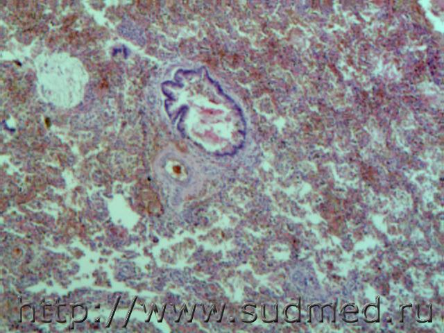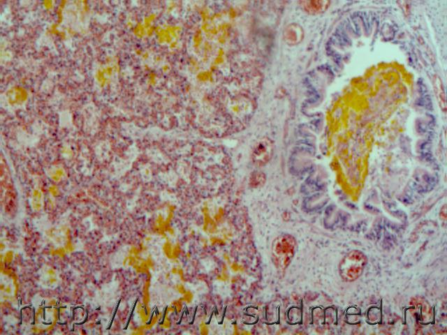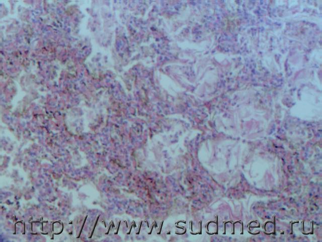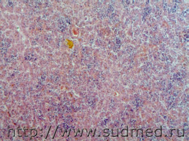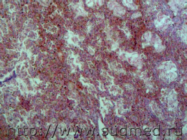 Гемолитическая болезнь у новорожденного при резус-конфликте(гемосидероз в легких, гемохроматоз в печени(экстрамедуллярные очаги кроветворения в печени) и селезенке) .У матери Rh-, у новорожденного мальчика Rh+.