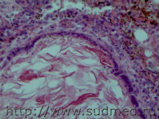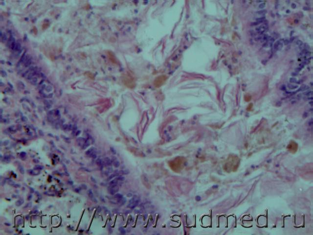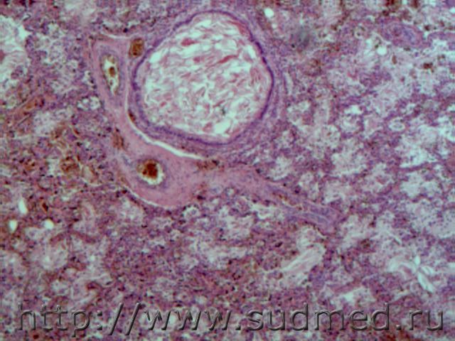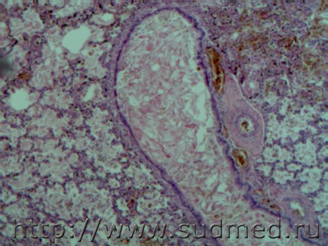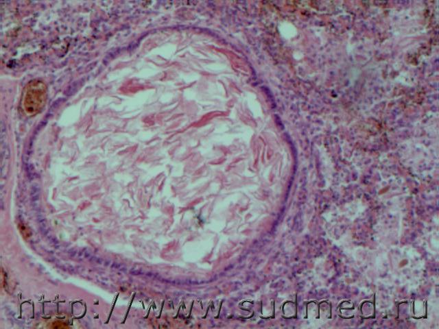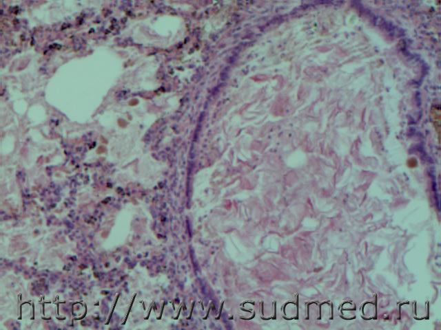 Аспирация околоплодными водами при родах в легкие плода( в просвете бронхов и альвеолах плода видны роговые массы)