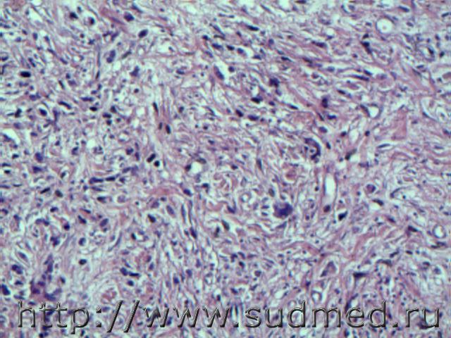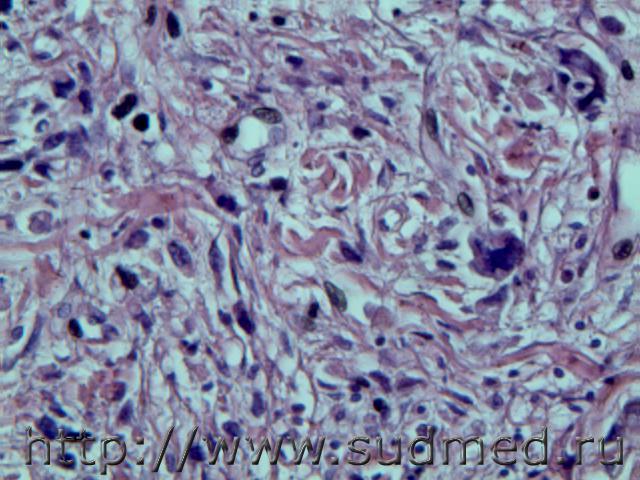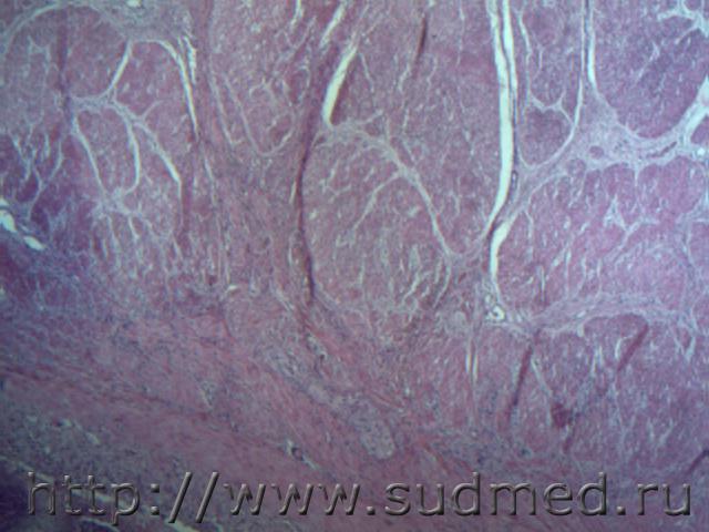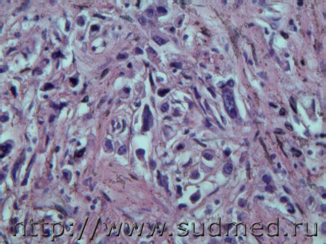 Недифференцированный рак желудка( сочетание слизистой с единичными перстневидными клетками и лейомиобластоматозной в мышечном слое атпических клеток с патологическими митозами.)