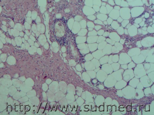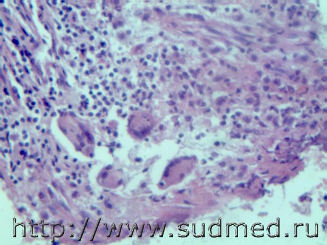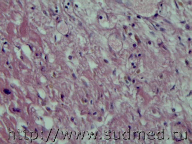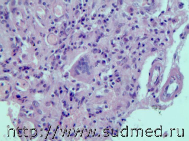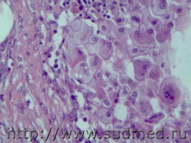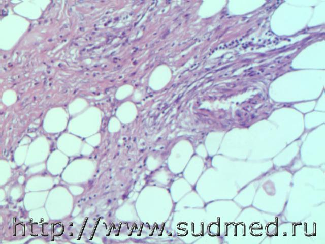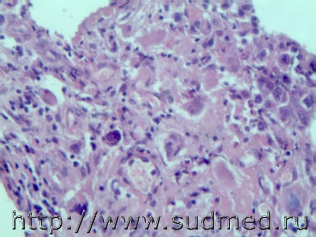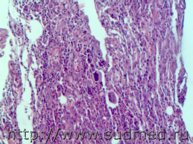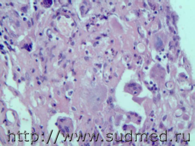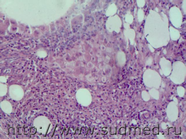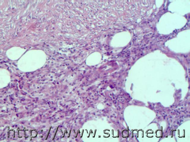 Гигантоклеточное гранулематозное(неинфекционное, продуктивное)) воспаление на оставленную в брюшной полости марлевой салфетки размером 10*8*3см.при Кс. Инфильтрат при УЗИ и КТ обнаружен в мезогастральной области. Салфетка с инкапсулированным инфильтратом удален через 32-34 дней. Инфильтрат состоит из множество капилляров, эптелиоидных и круглых клеток, многоядерных гигантских клеток по типу инородных тел и ксантомных клеток с пенистой цитоплазмой(олеогранулемчики), а так же разрастание рыхлой соединительной ткани разной степени зрелости в жировой ткани.