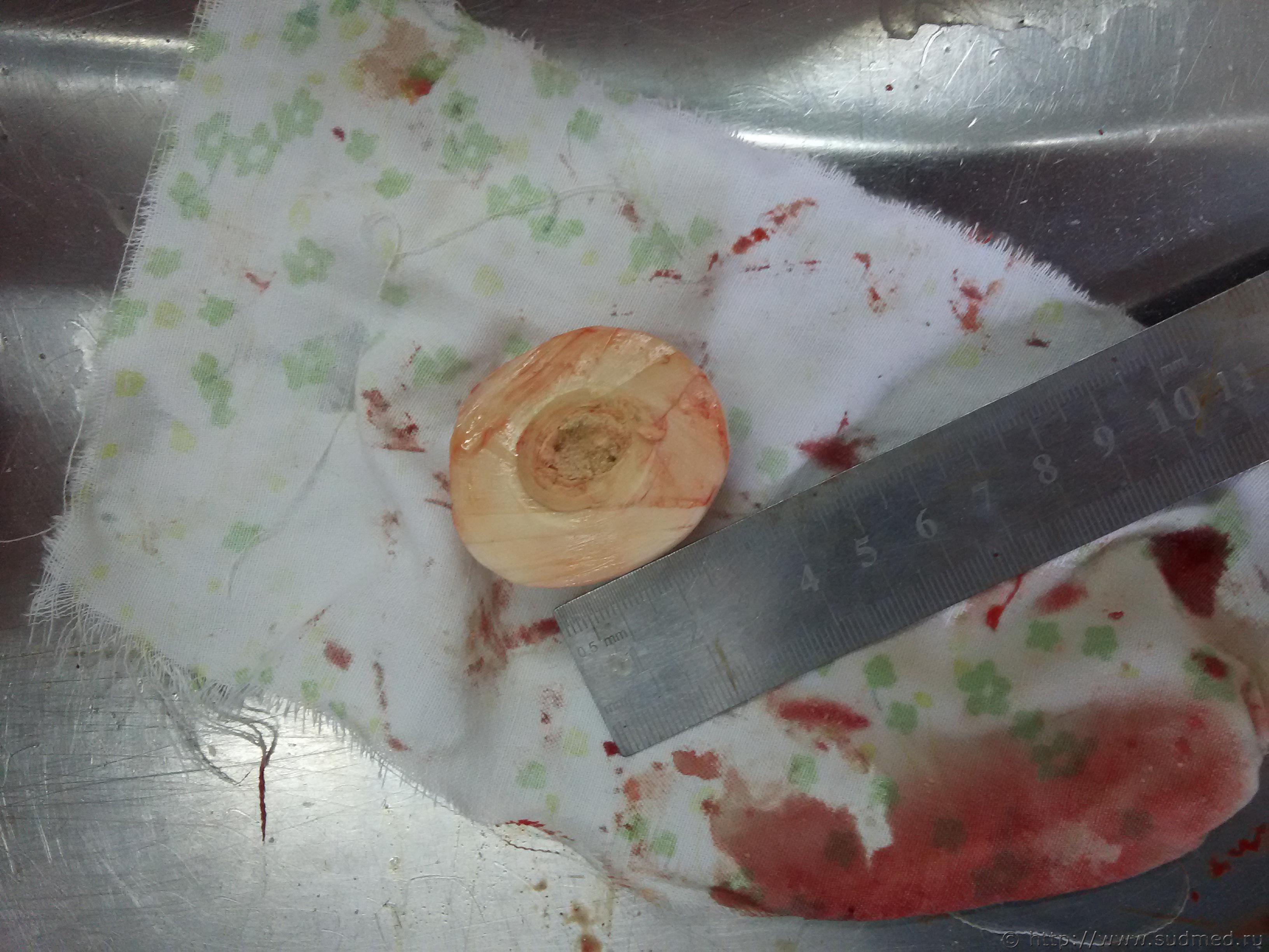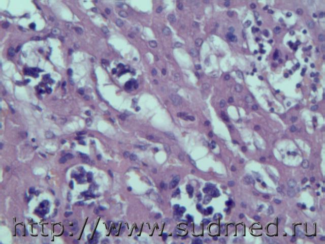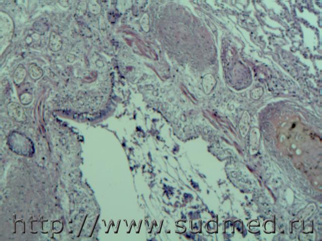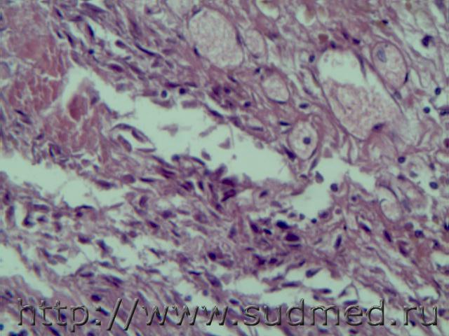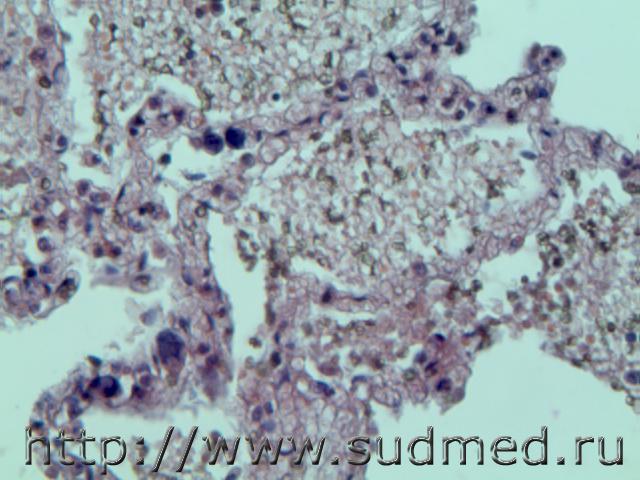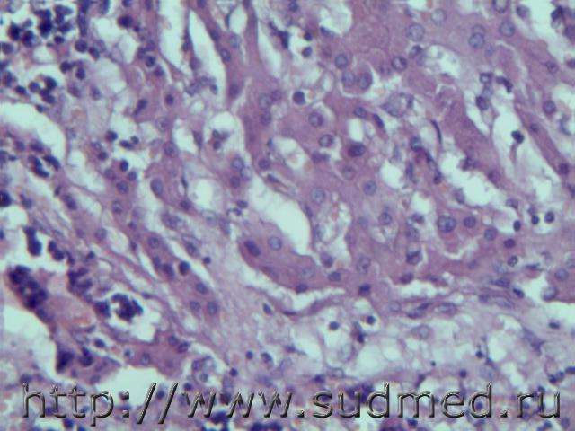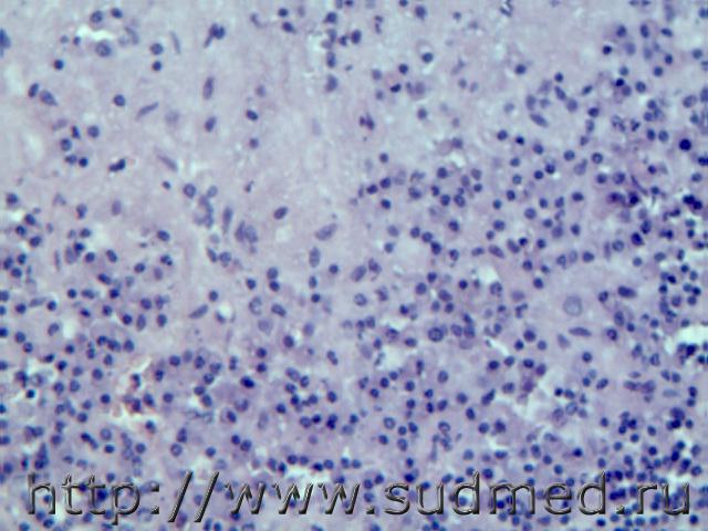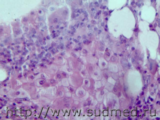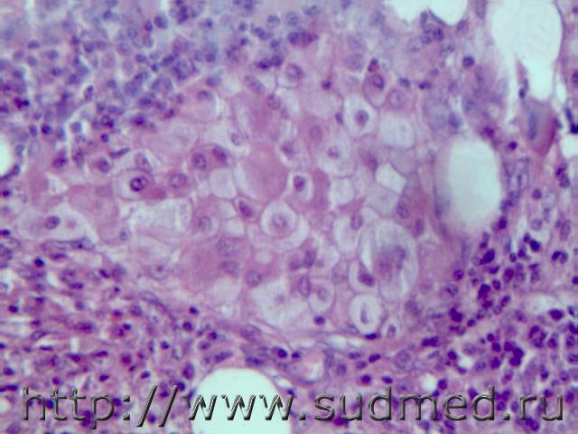 Гигантоклеточное гранулематозное(неинфекционное, продуктивное)) воспаление на оставленную в брюшной полости марлевой салфетки размером 10*8*3см.при Кс. Инфильтрат при УЗИ и КТ обнаружен в мезогастральной области. Салфетка с инкапсулированным инфильтратом удален через 32-34 дней. Инфильтрат состоит из множество капилляров, эптелиоидных и круглых клеток, многоядерных гигантских клеток по типу инородных тел и ксантомных клеток с пенистой цитоплазмой(олеогранулемчики), а так же разрастание рыхлой соединительной ткани разной степени зрелости в жировой ткани.