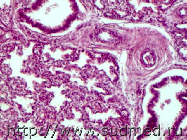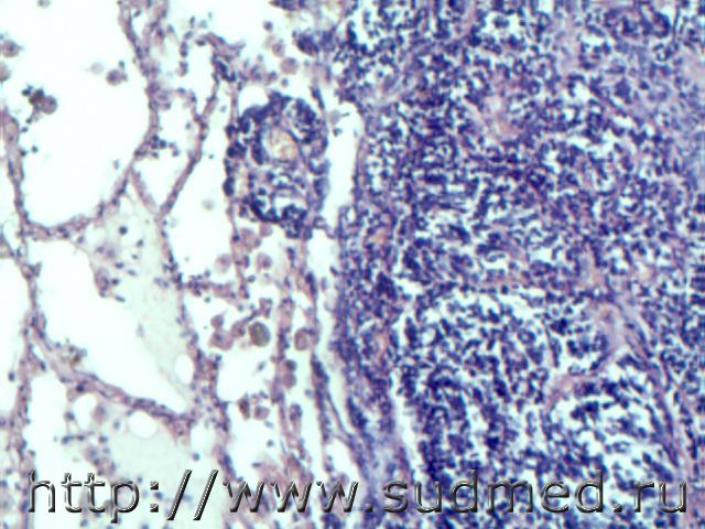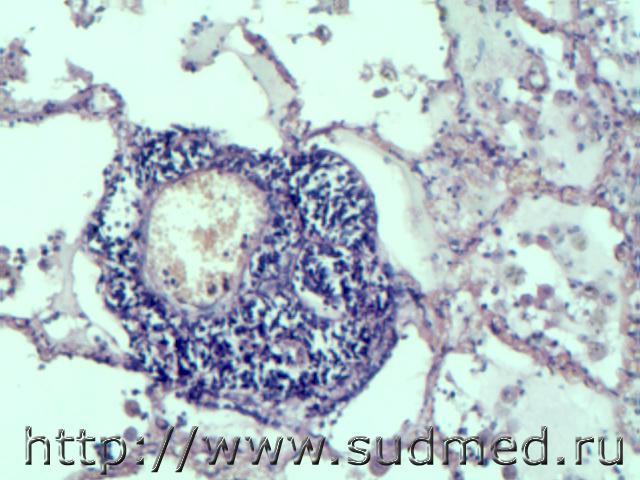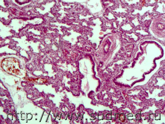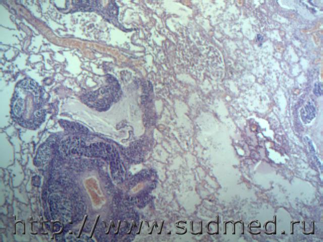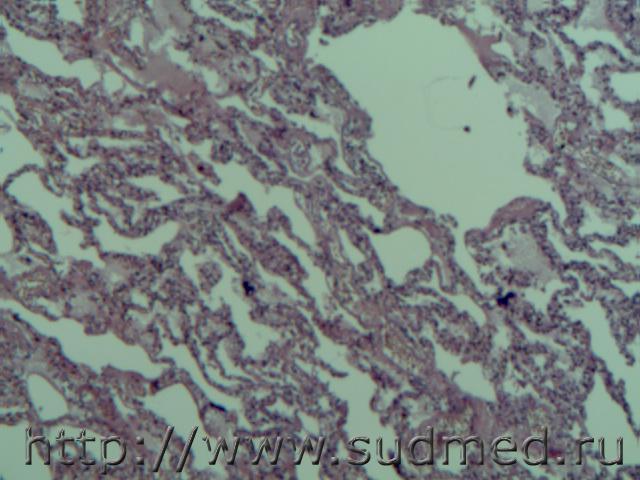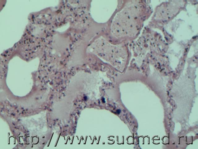 Микроморфология шокового легкого при ТравШ,ЛекАнафШ,ОжогоШ.: острый лейкоцитоз,мегакариоцитоз, микротромбоз,бронхоспазм,отек с альвеолярными макрофагами, сладжирование эритроцитов, спазм артерии, неполный ателектаз.
