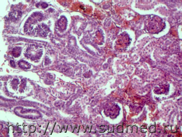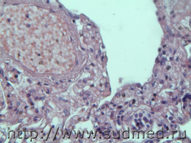 Недоношенность в сроке 26-28недель. Незрелость ткани легких и почки( широкие альвеолярные перегородки, примитивные клубочки в 2 слоя). Была попытка ИВЛ.