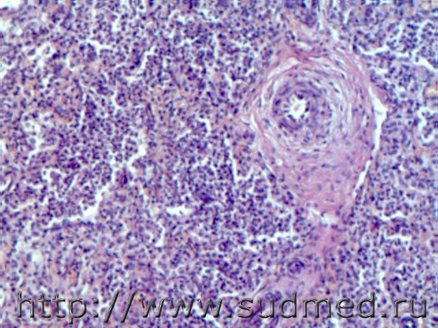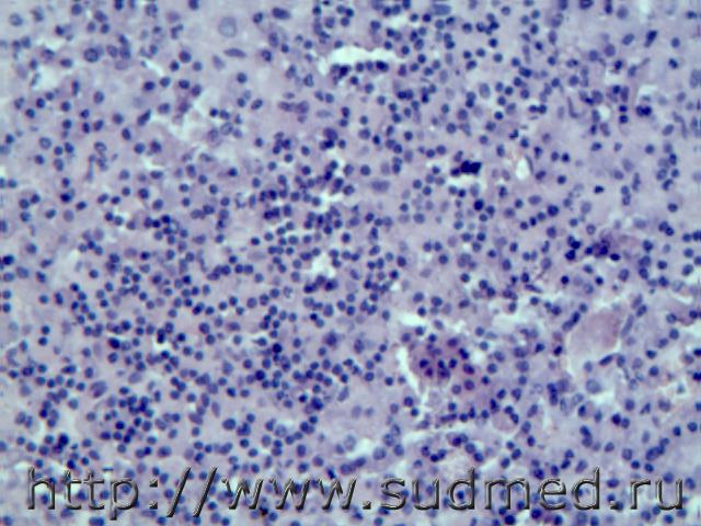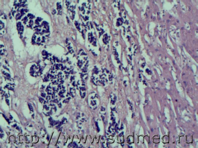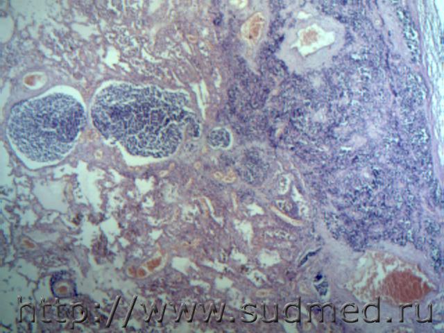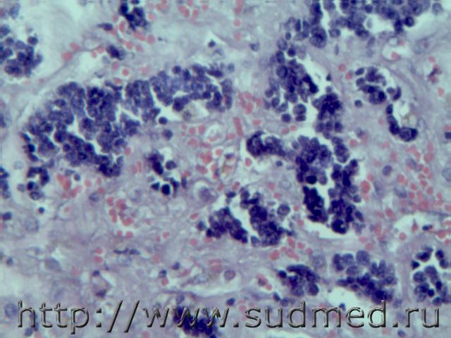 Мелкоклеточный рак легких у М.58 лет( лимфоцитподобные, овсяноклеточные), (мелкие гиперхромные оголенные клетки, размером чуть больше эритроцитов)расположенные периваскулярно, субплеврально с метастазами в печень.