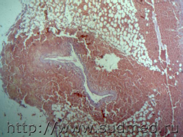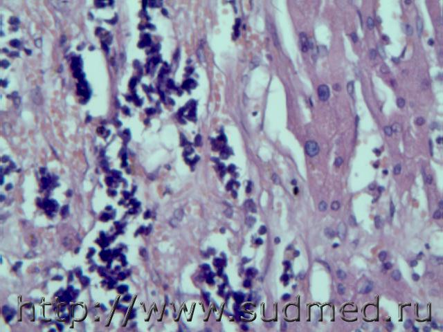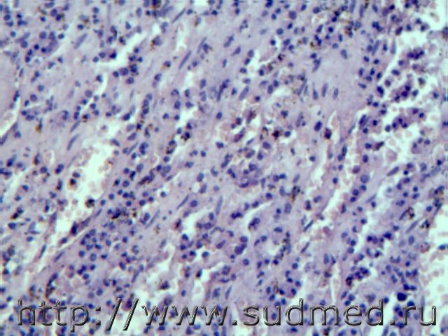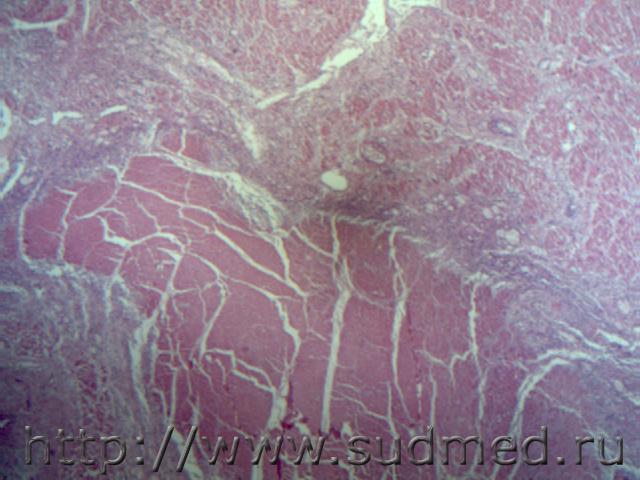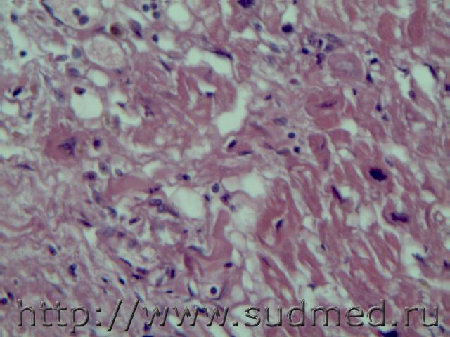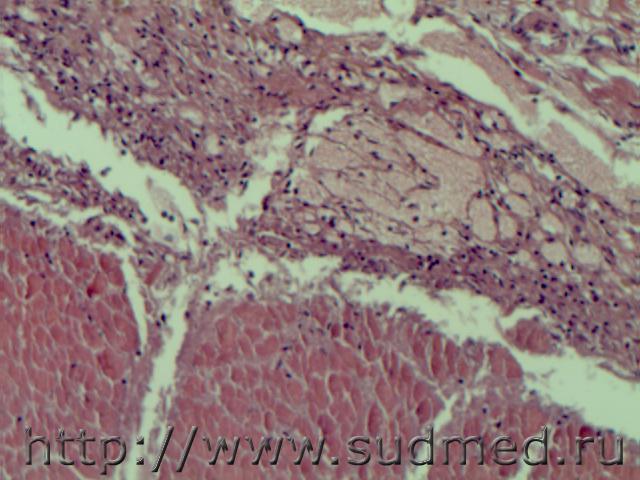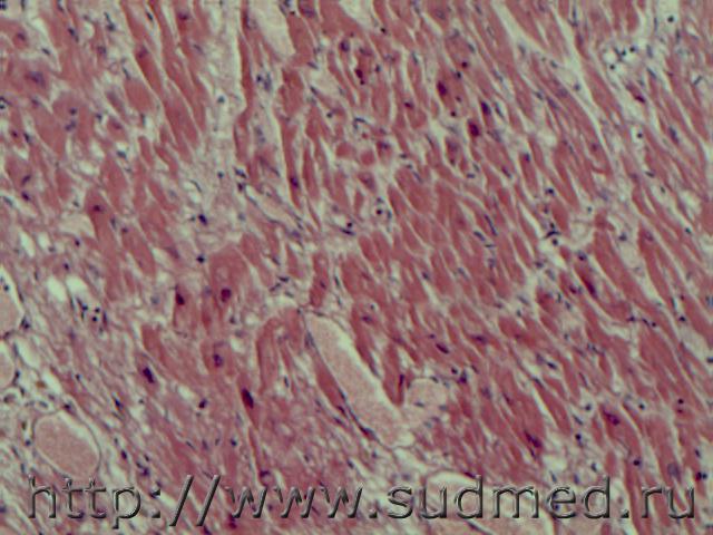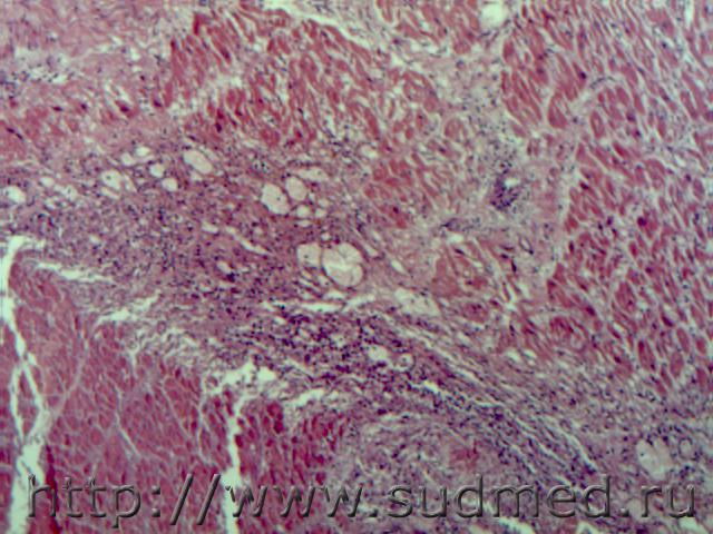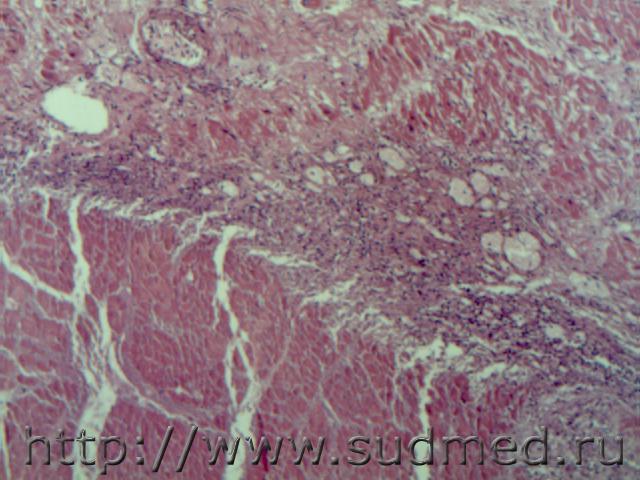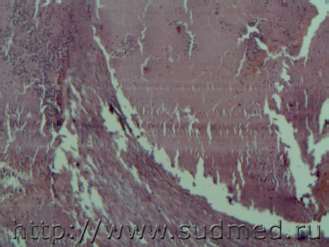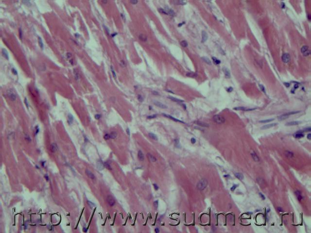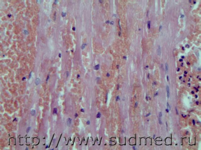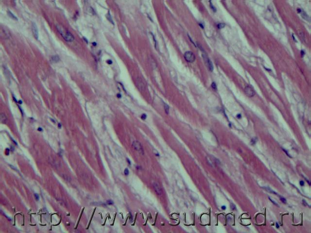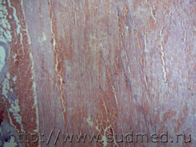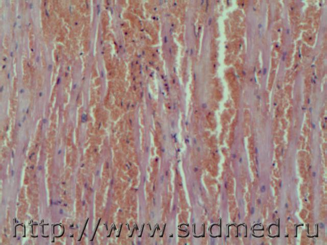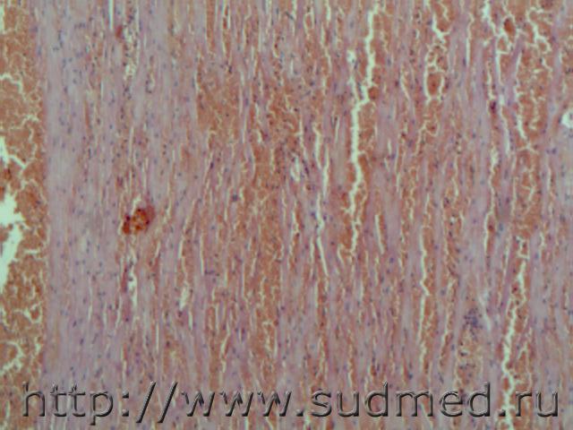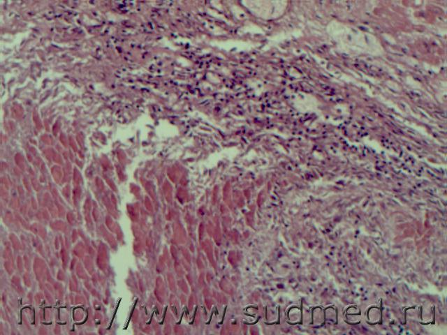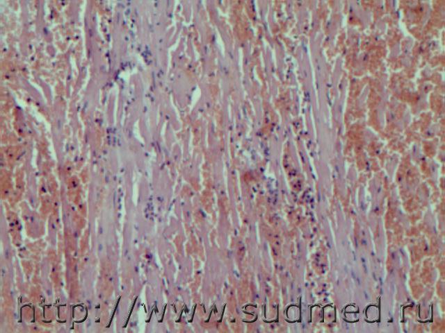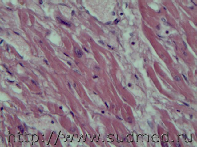 Ушиб сердца.уличная драка. М 37 лет. Кровоизлияние эпикарда и в строме миокарда с умеренной лейкоцитарной реакцией. Повреждение кардиомиоцитов.