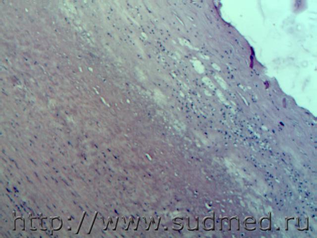 Сифилитический мезаортит восходящей части (гуммозная дезорганизация медии с разрывом и кровоизлиянием в медиастинум) очаг гуммы с валом эпителиоидной, лимфоцитарно-плазмцитоклеточной инфильтрацией. М.52года.