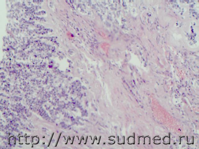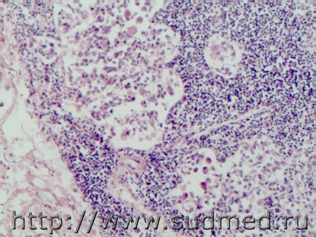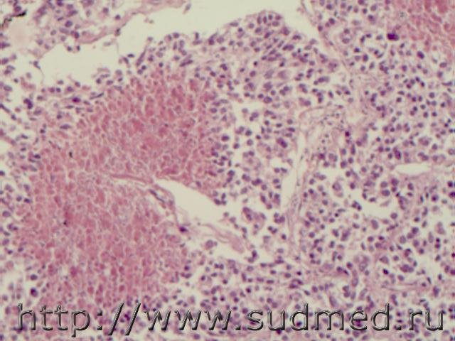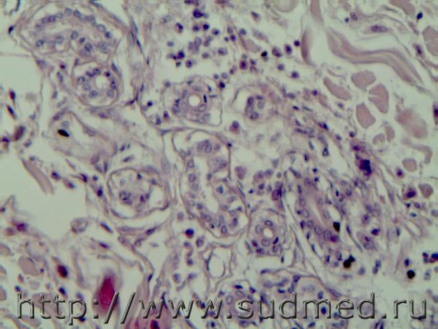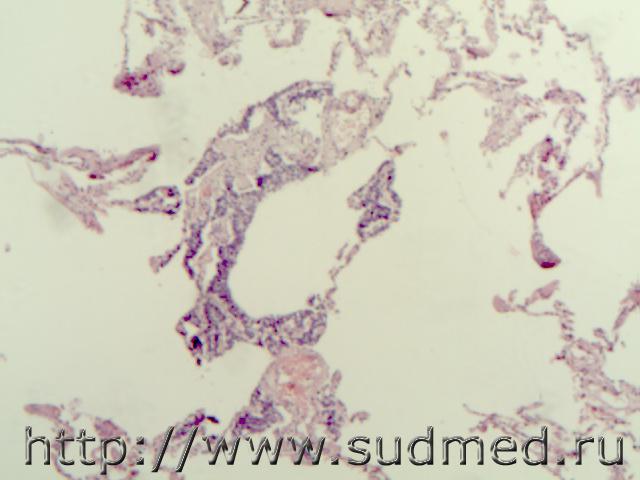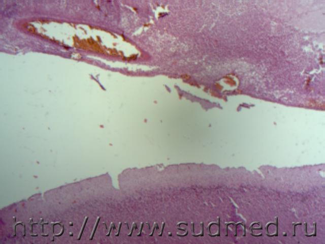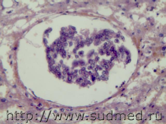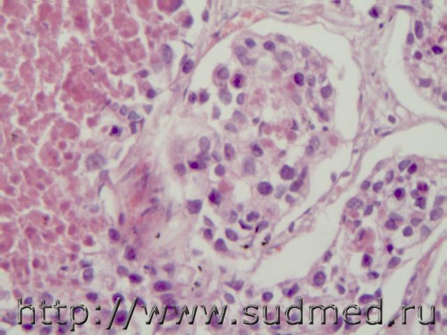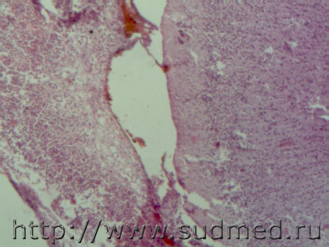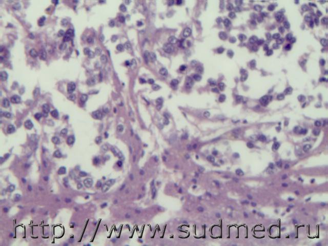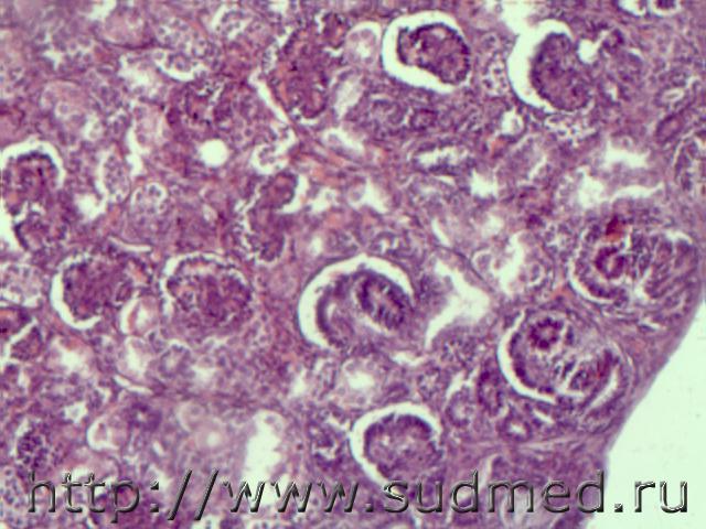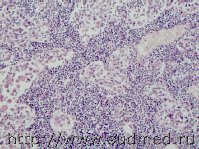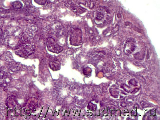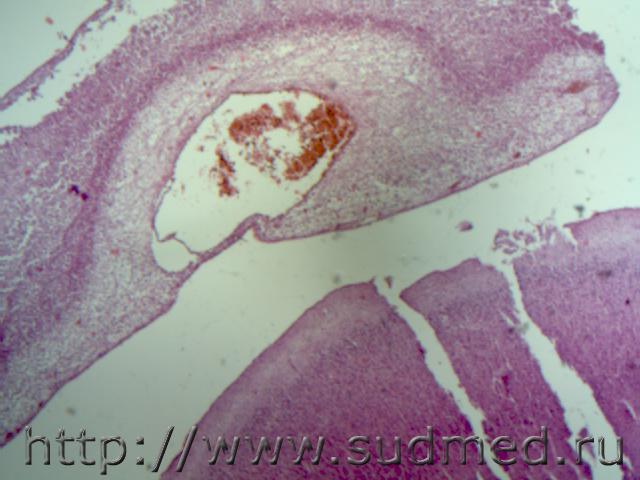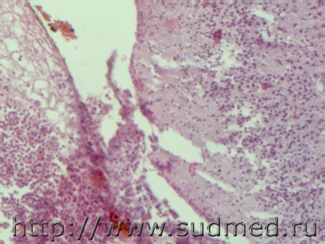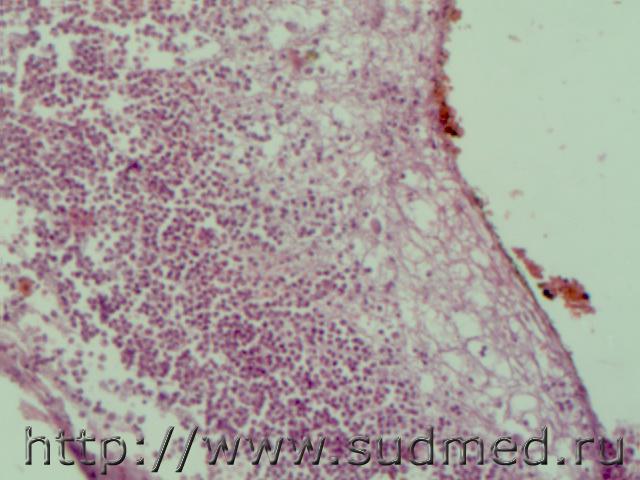 Новорожденный,6 дней.Гнойный менингит,незрелость внутренних органов(примитивные клубочки,широкий глиальный слой, широкие альвеолярные перегородки)