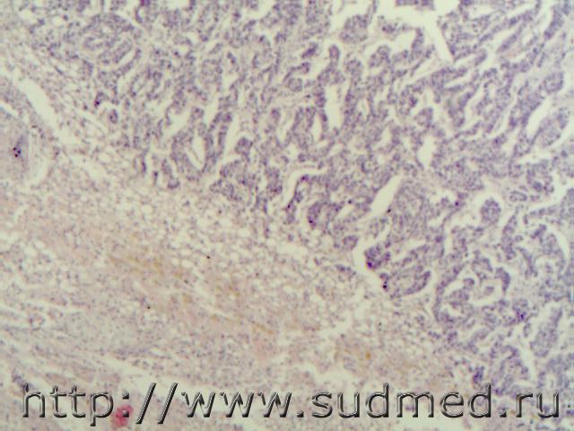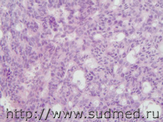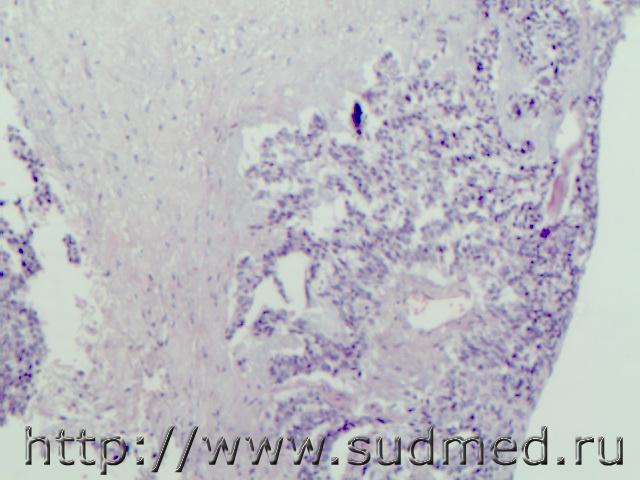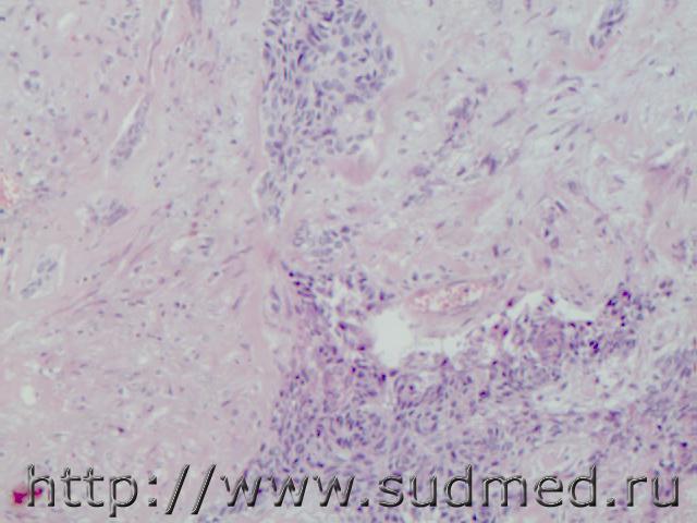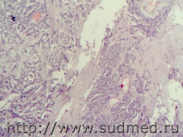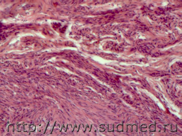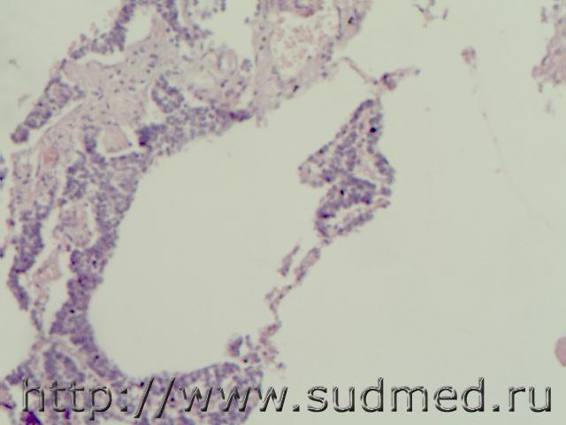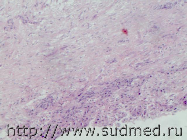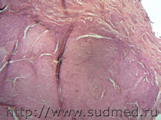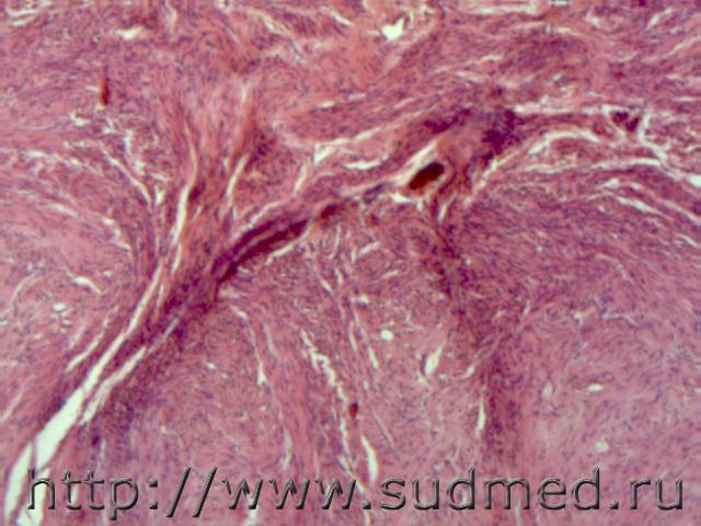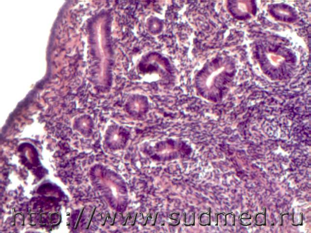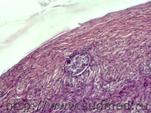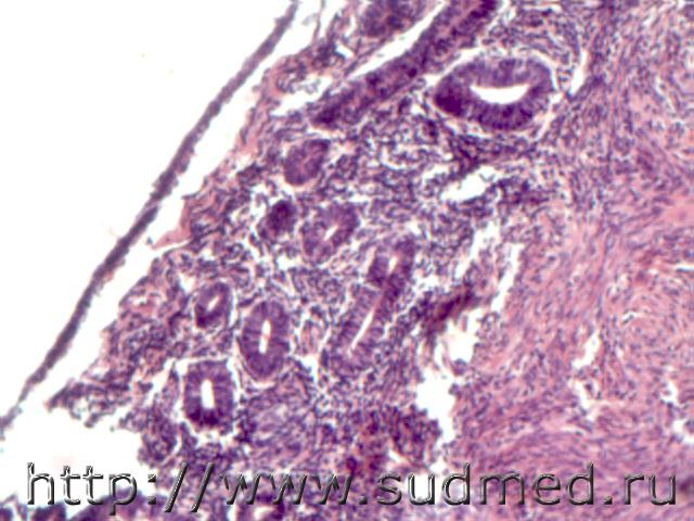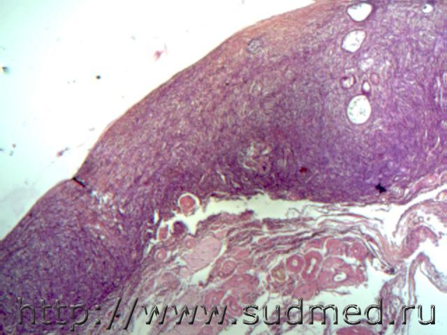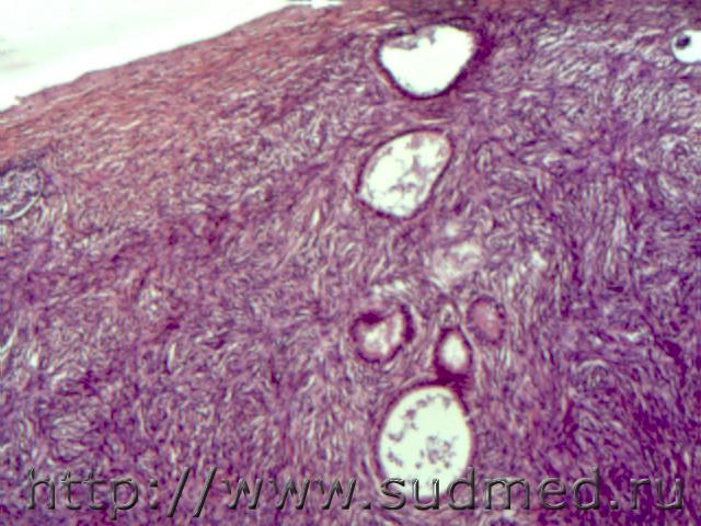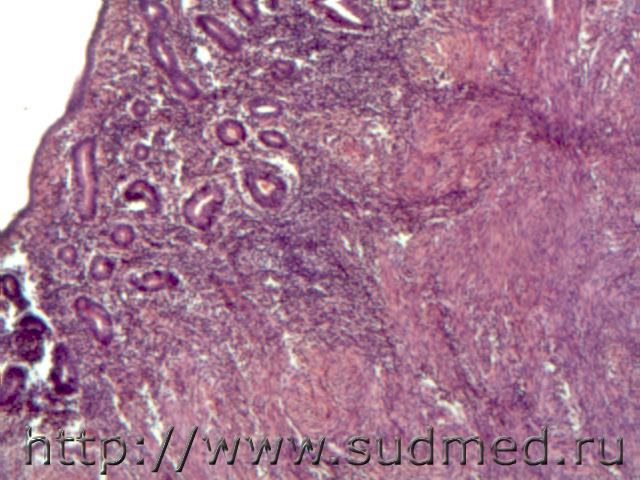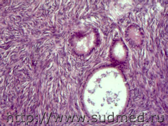Ж.69 лет. Атрофический эндометрий( отсутствия слоев), атрофия яичника(узкий корковый слой с единичными нефункционирующими фолликулами) и белые тела с гиалинизированными сосудами в мозговом слое), лейомиома матки.