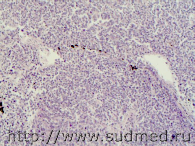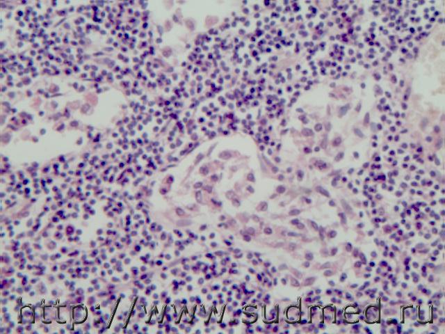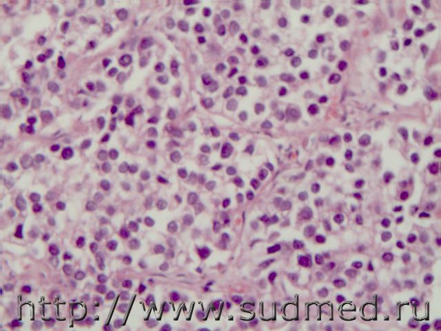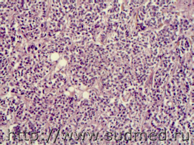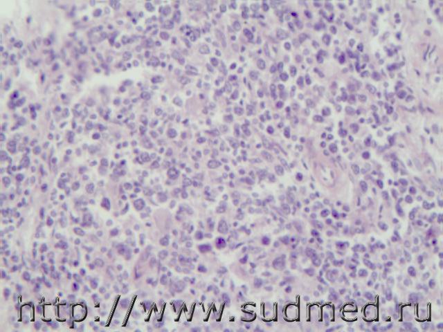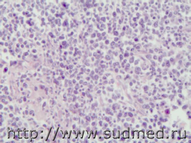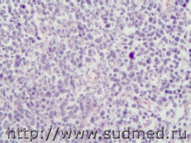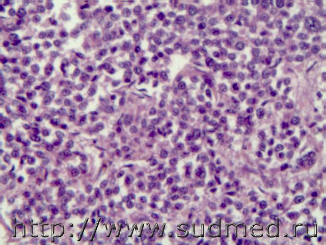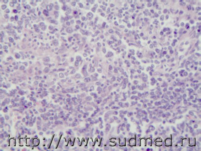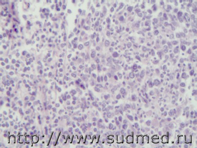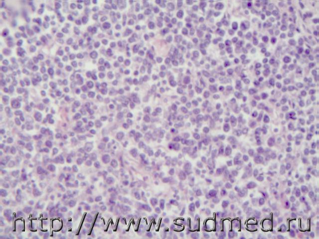 Лимфосаркома(лимфоузлы легких и брыжейки, укрупненные ядра с изменением формы с выемкой(расщепление), если по внимательнее смотреть и В-лимофцитарного генеза и характерные для пролимфоцитарной лимосаркомы.
