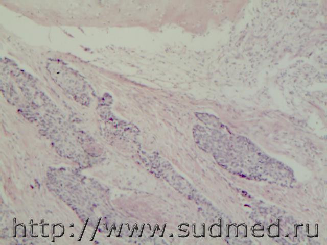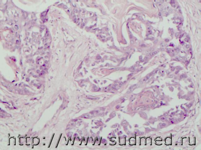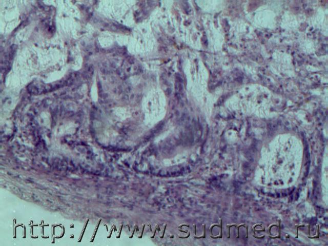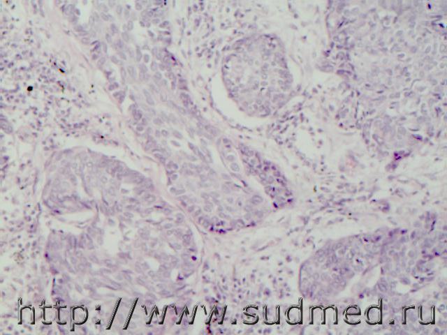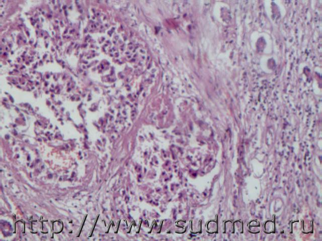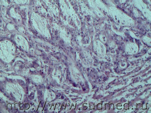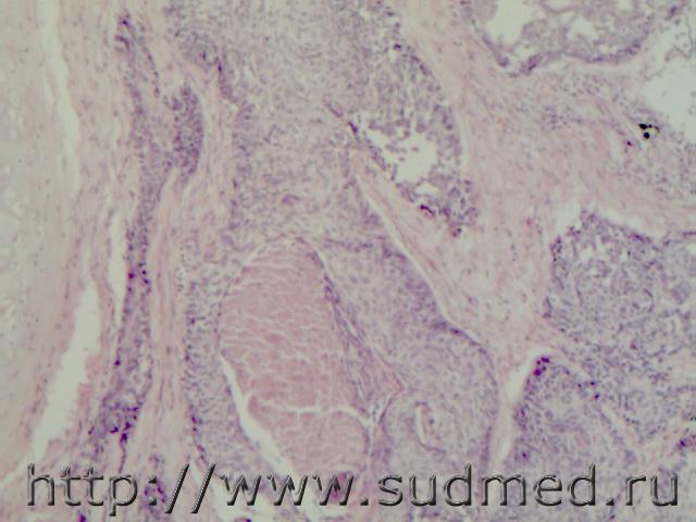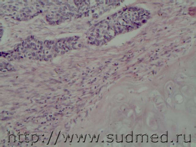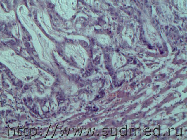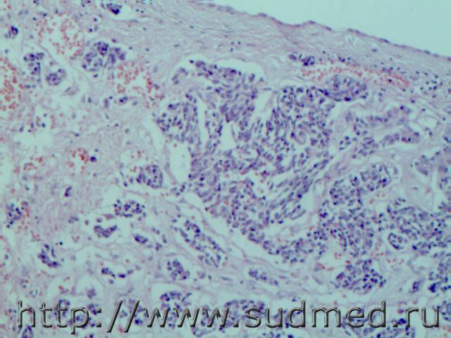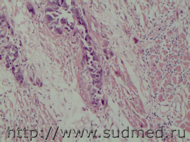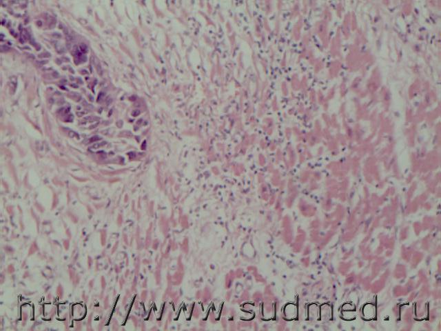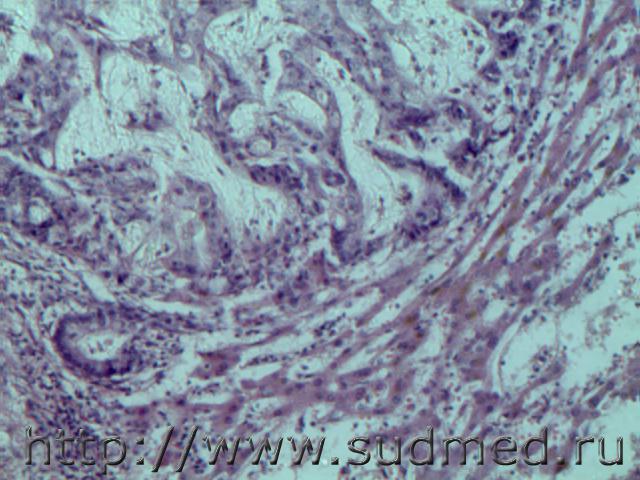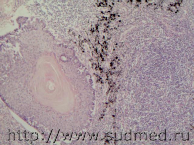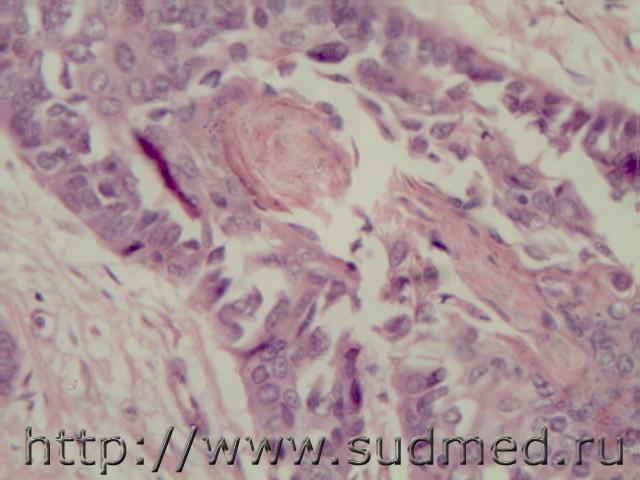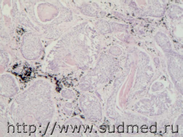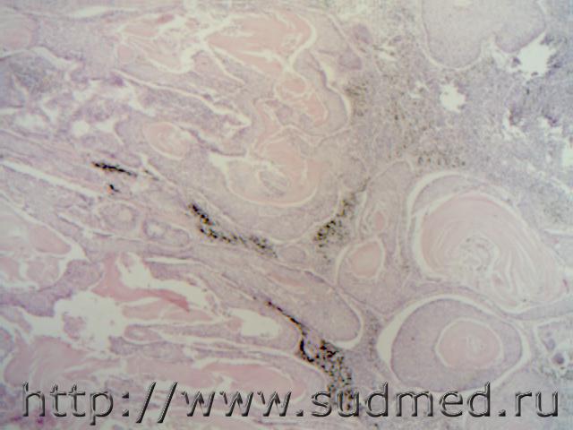 Эпидермоидный рак легких с метастазами л/у и в миокард( центральным ороговением,стратификацией, базальноклеточная ориентация, плоские клетки с межклеточными мостиками)