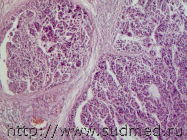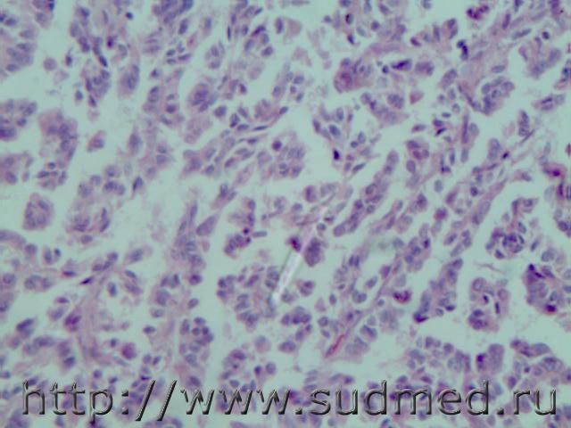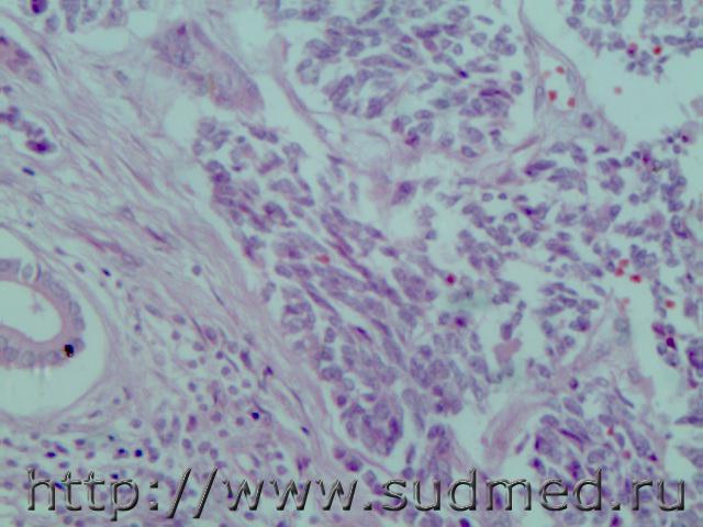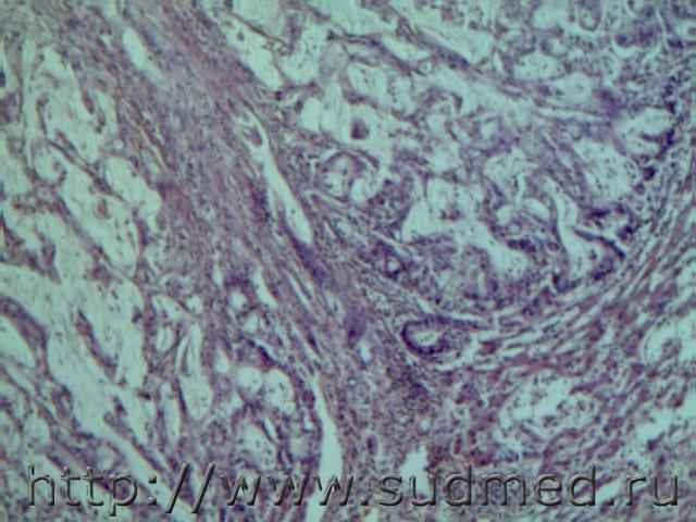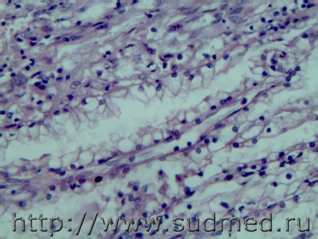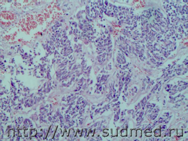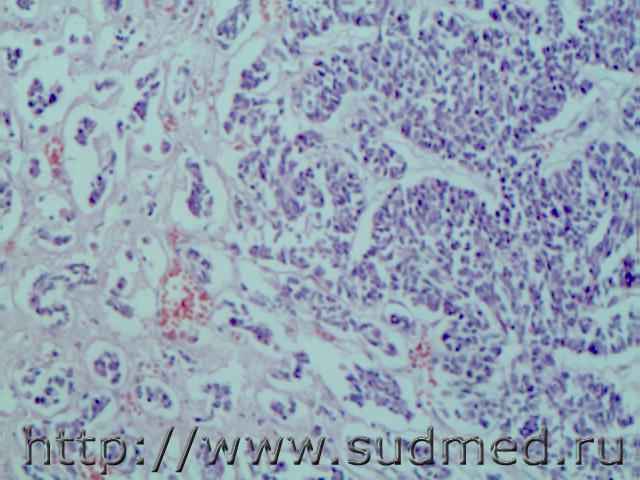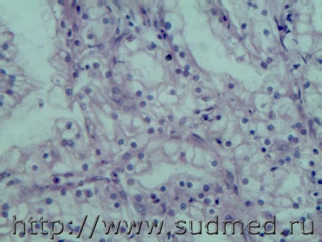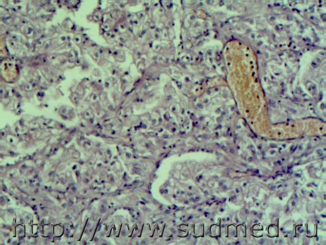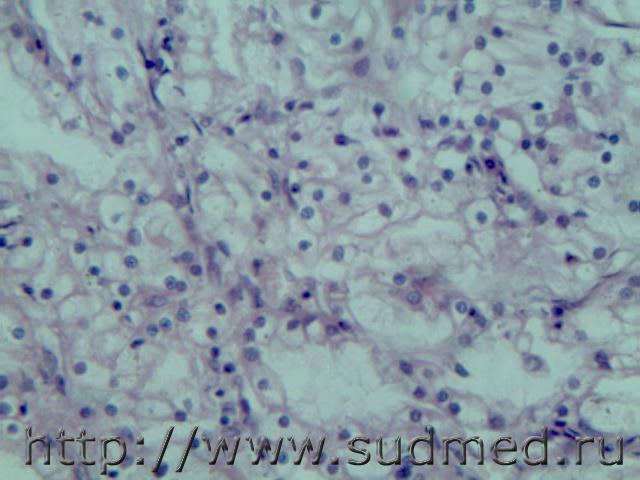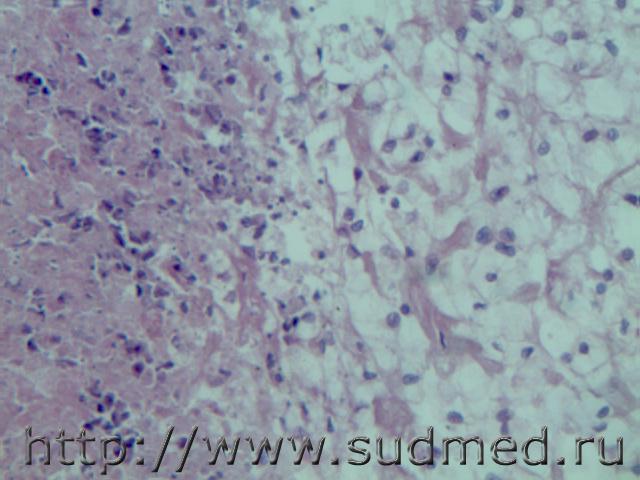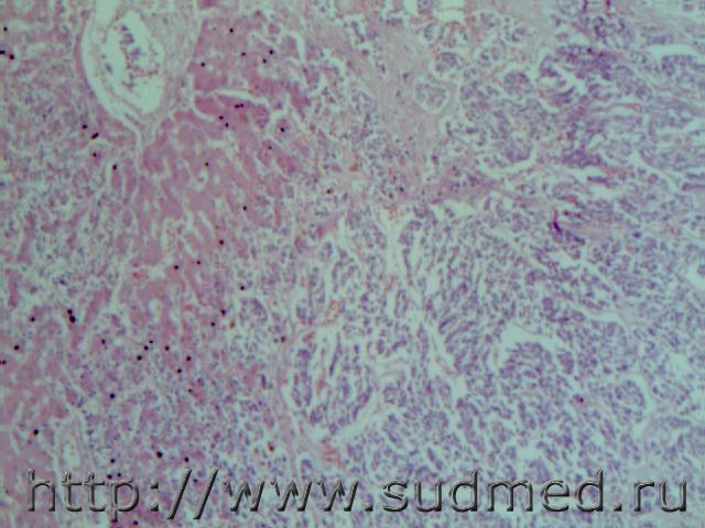 Светлоклеточный рак почки с гематогенным метастазом в легкие.(крупные клетки со светлой цитоплазмой и в почке и в легком видны очаги распада)