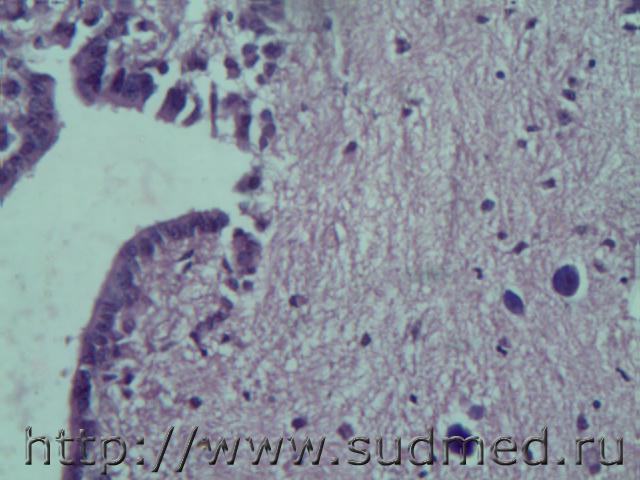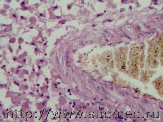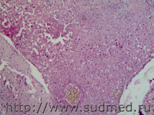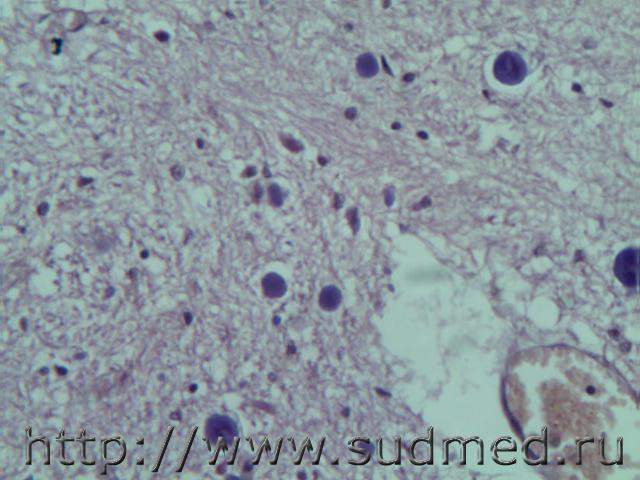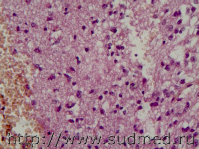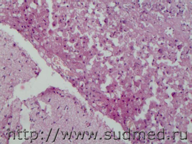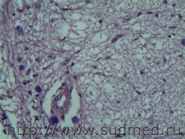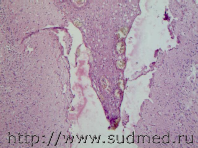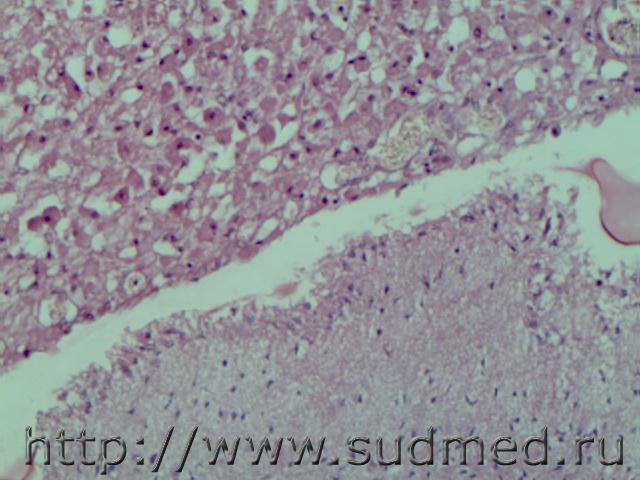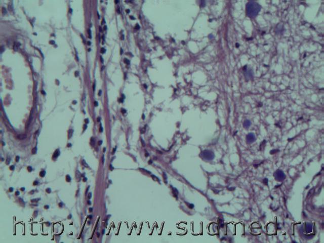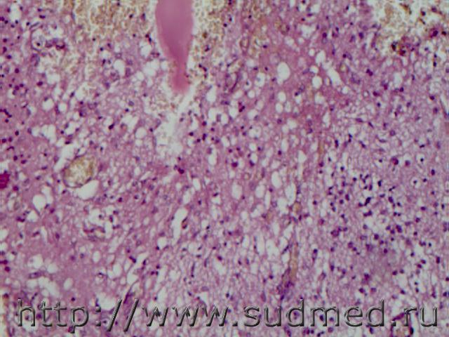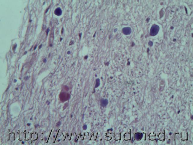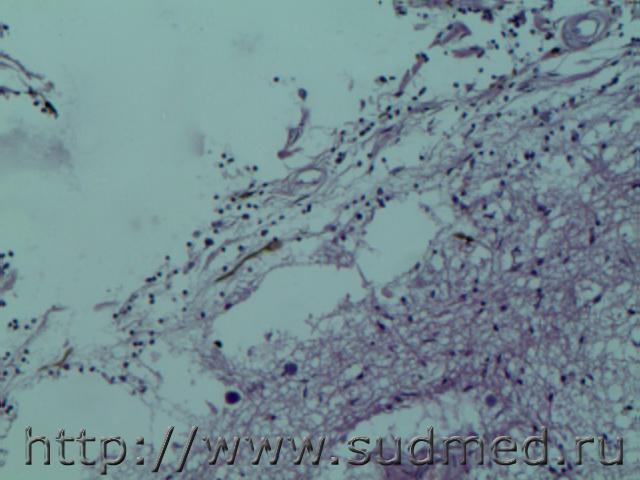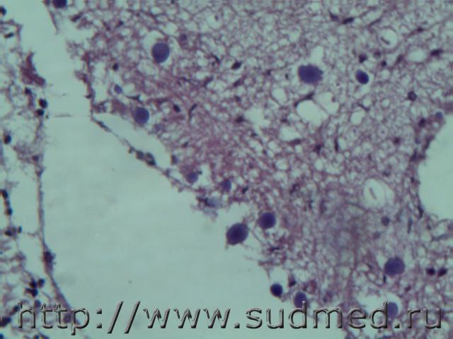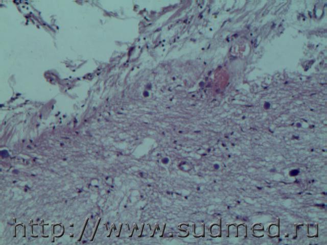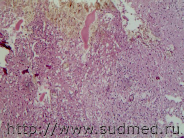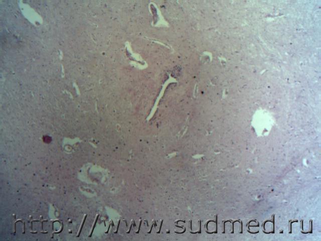 Тот же случай.ЗЧМТ.за 12 к\д изменение мягкой мозговой оболочки со множеством зернистых оксифильных шаров. В веществе коры г/м видны очаги ишемического размягчения и кровоизлияния, отек, дистрофия. некробиоз и некроз нейроцитов.